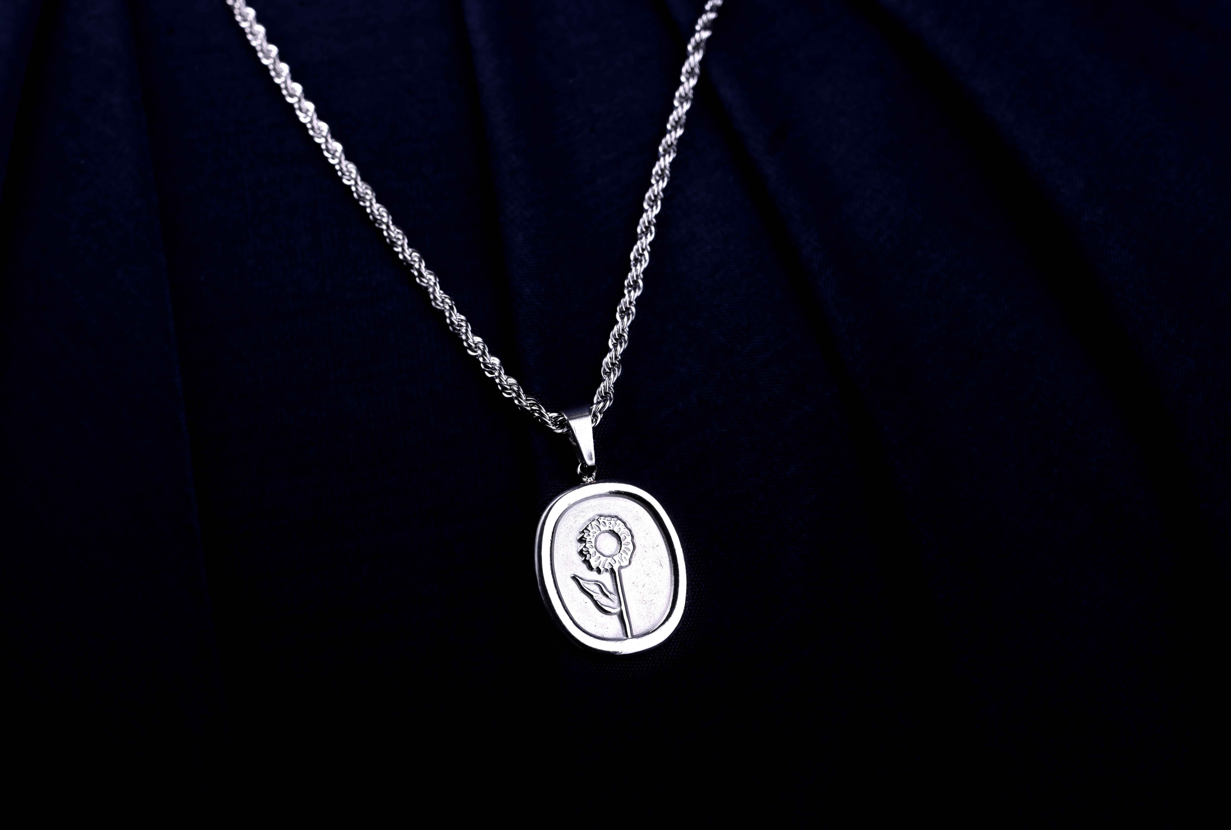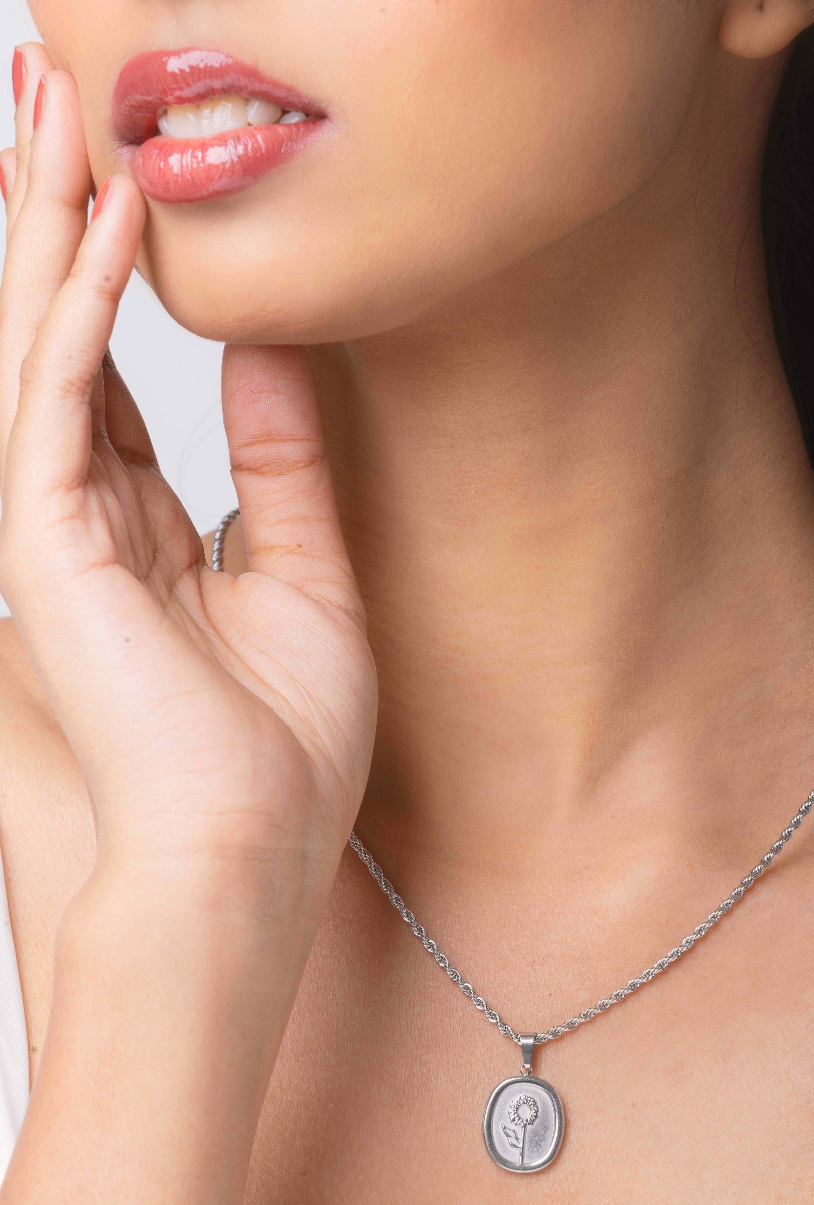Introducing the Silver Sunflower Necklace from Aventara, crafted in stainless steel for nature-inspired elegance. An oval pendant with an engraved sunflower motif hangs from a twisted chain, exuding subtle sophistication.