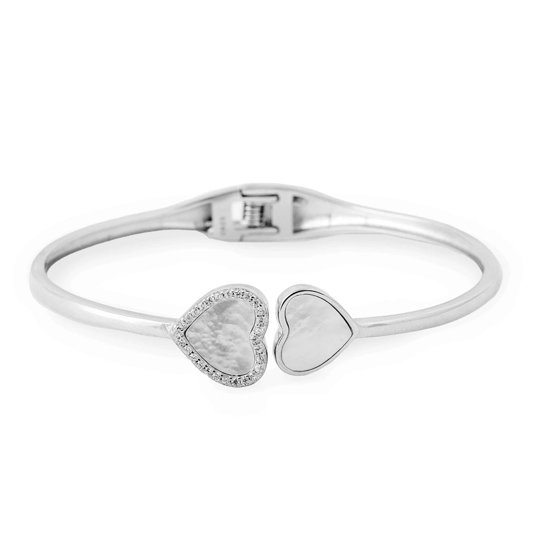 Adorn your wrist with the Twin Heart Bangle from Aventara, featuring two elegant heart-shaped mother of pearl inlay framed with sparkling accents, set in 92.5 sterling silver.