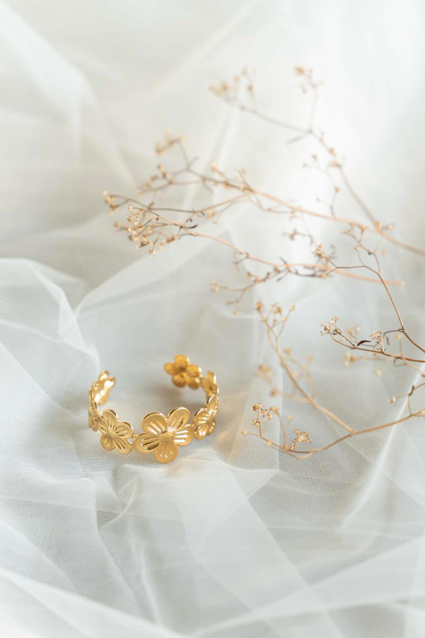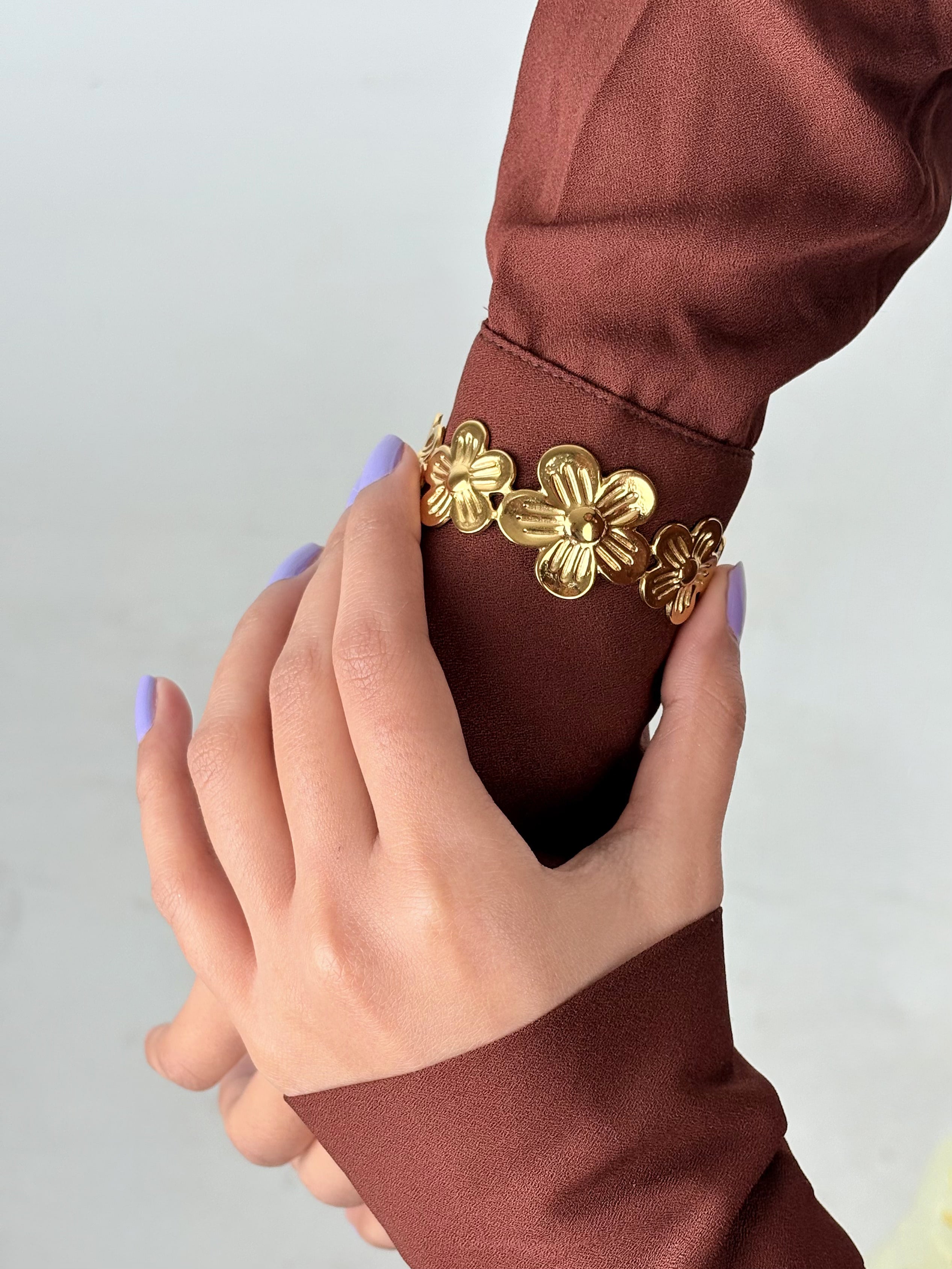 Add charm with the Floral Symphony Bracelet, featuring floral charms in 18k gold-plated stainless steel. Water-proof and anti-tarnish, it shines effortlessly.