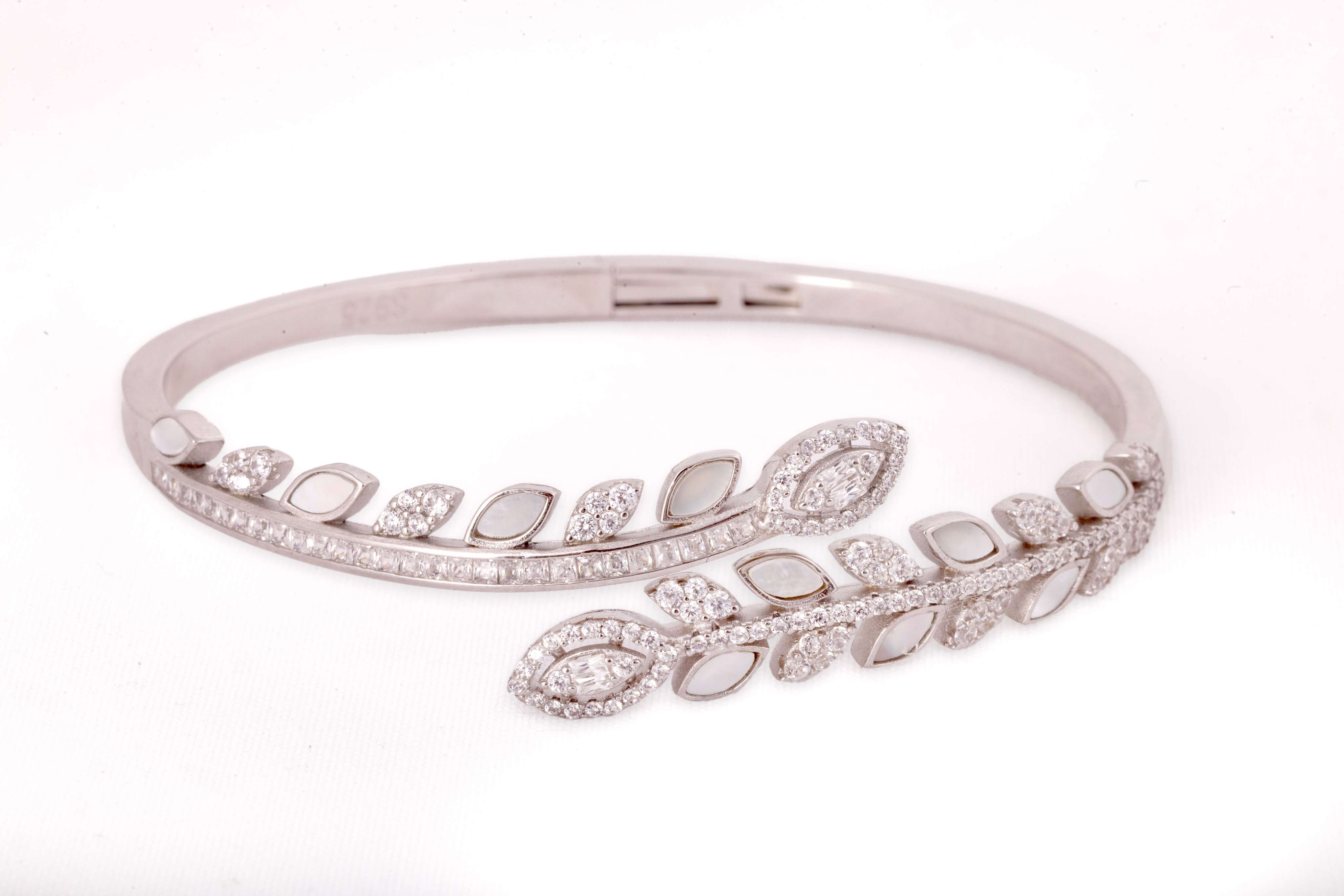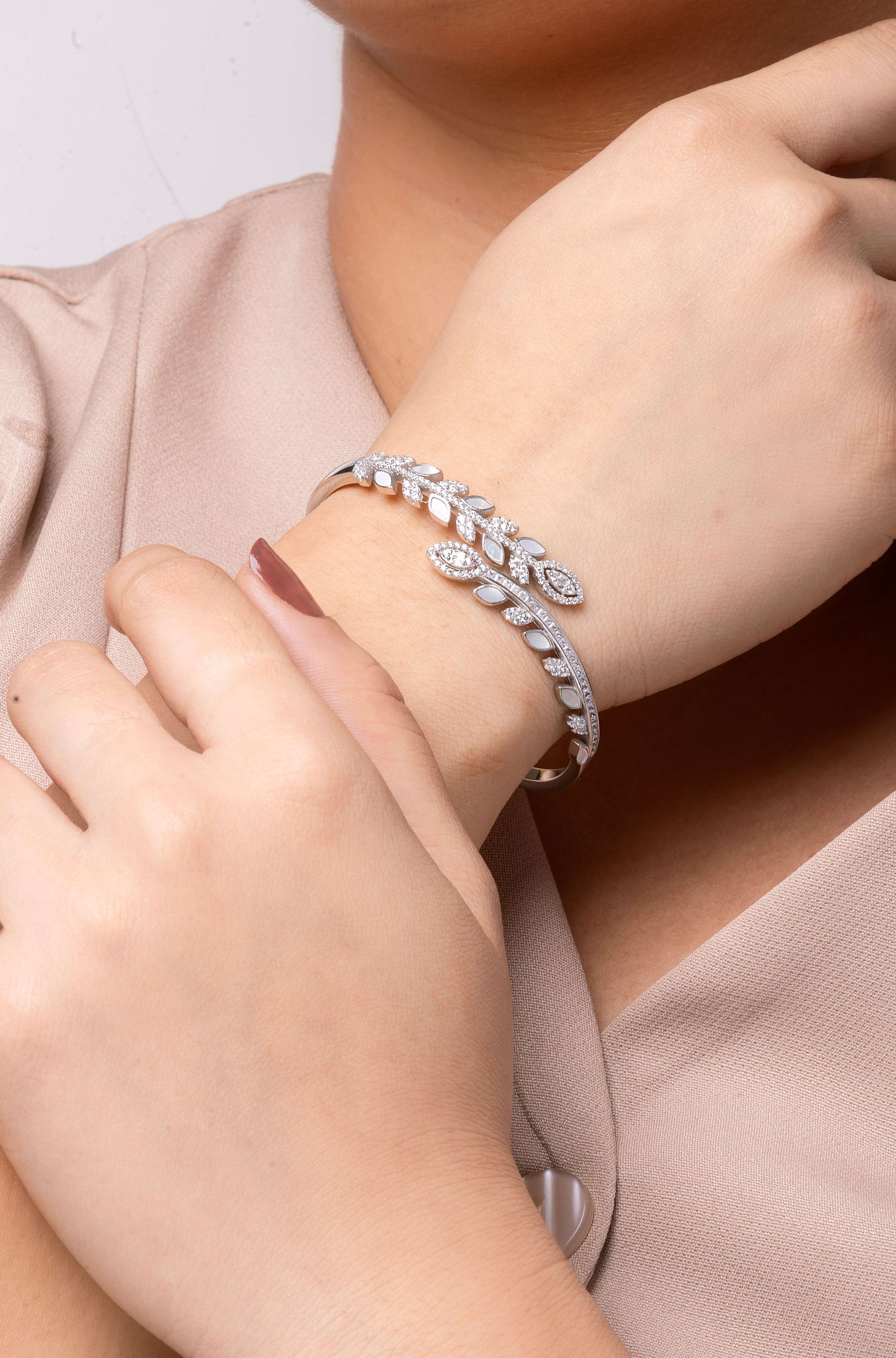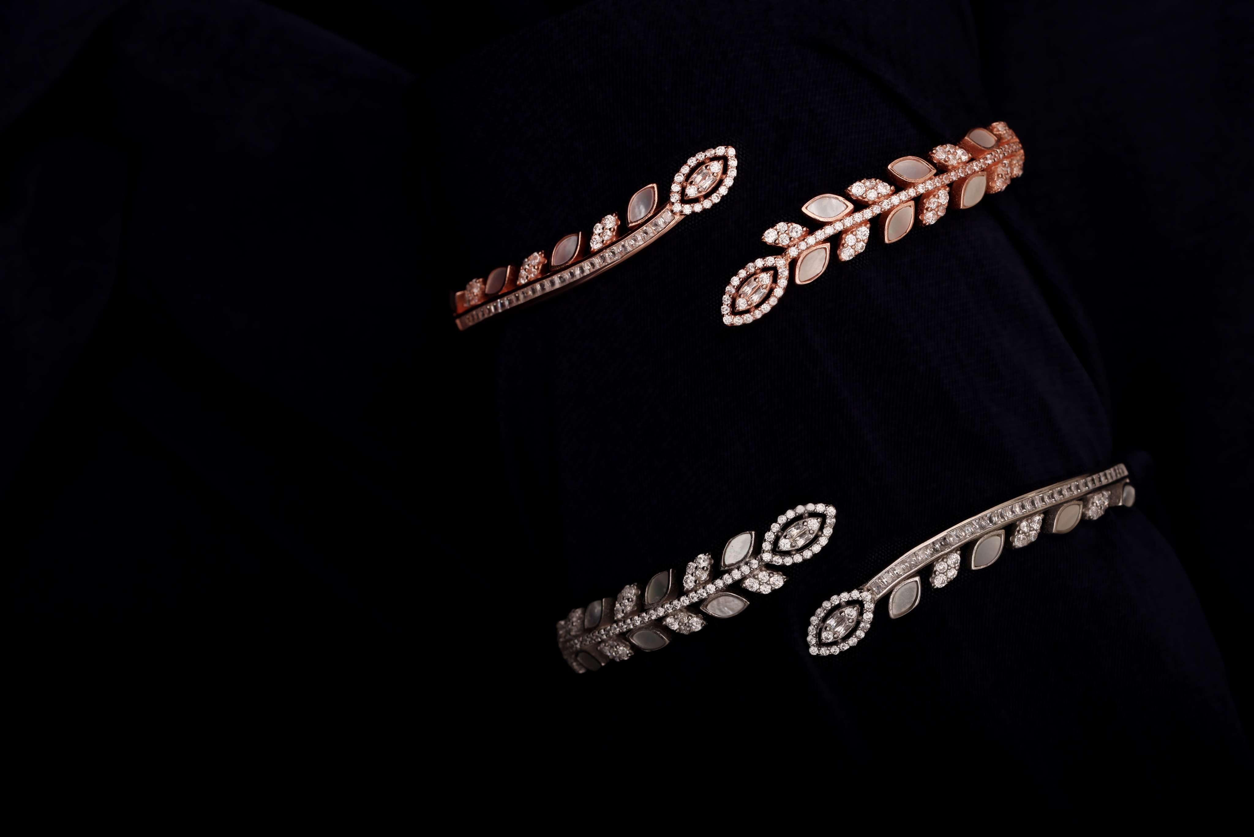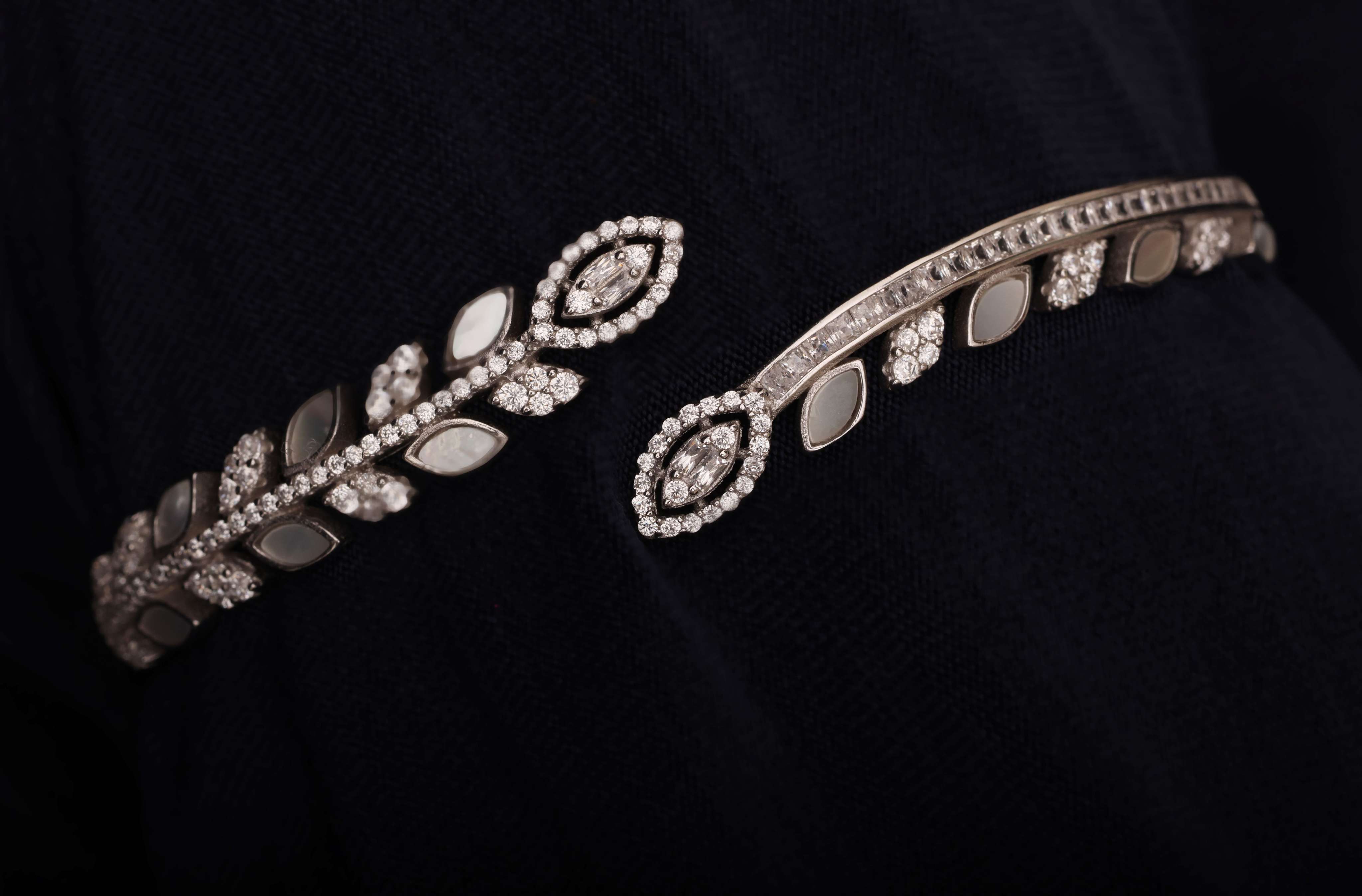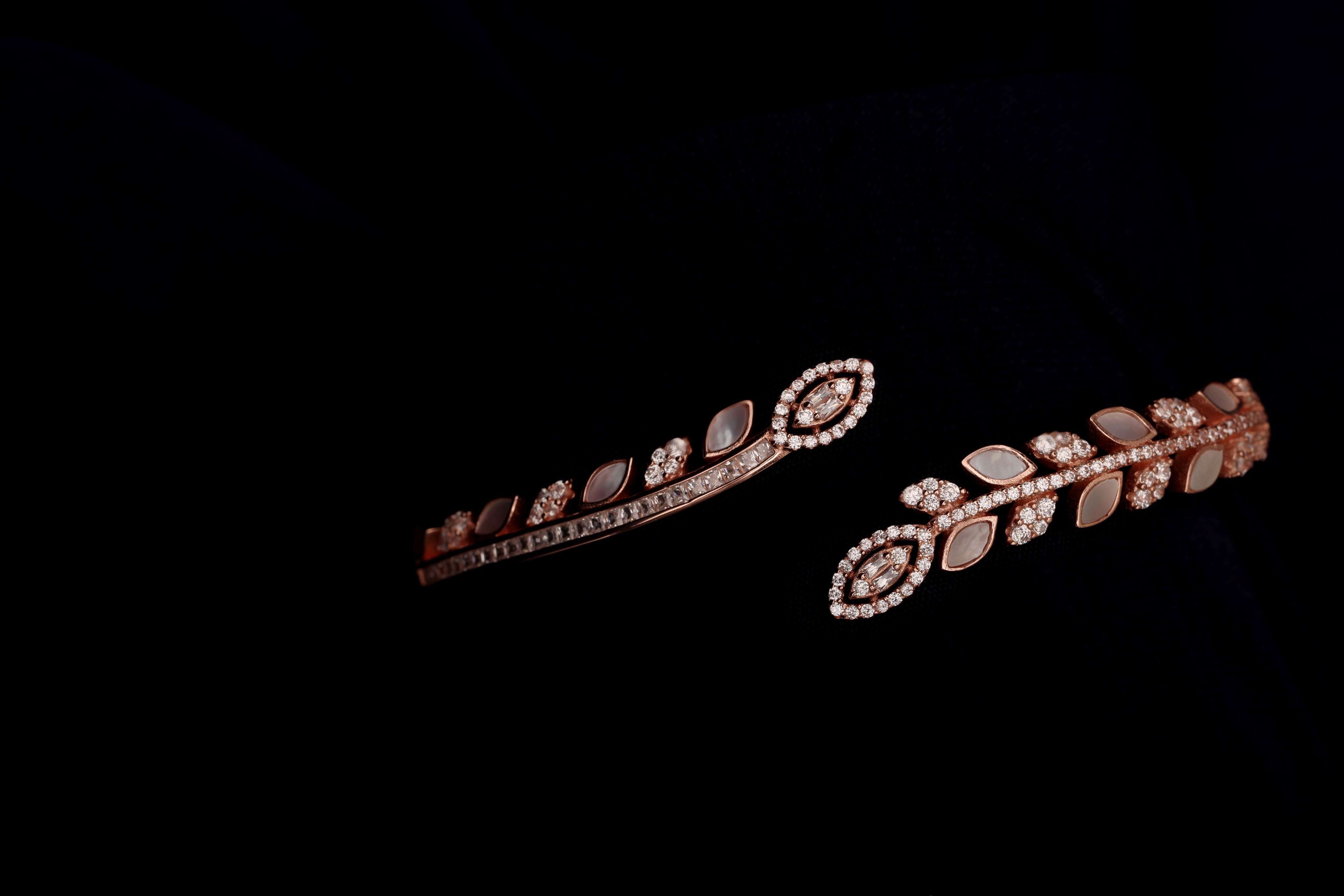 A delicate bangle bracelet featuring two complementary petals, one minimalist and one adorned with sparkling zircons. This piece symbolizes self-love and harmony, perfect for everyday wear or as a meaningful gift.