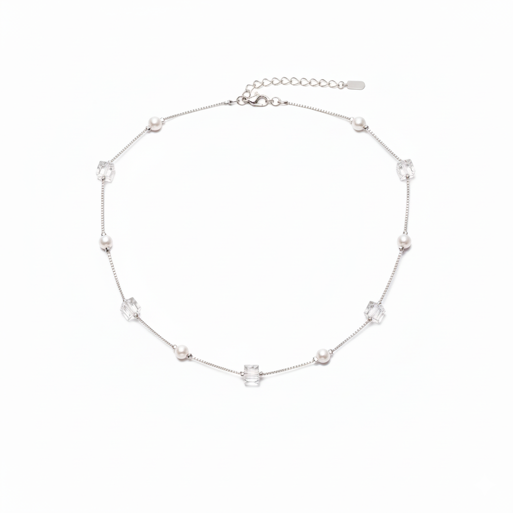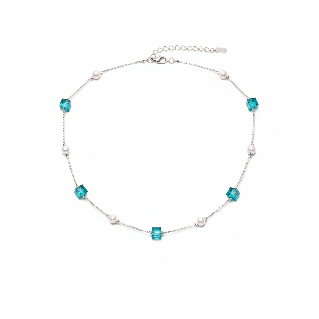 The Design Philosophy: The Azure Cube Pearl Necklace blends geometry and grace in a strikingly modern silhouette. Crafted in 92.5 sterling silver, it features alternating teal crystal cubes and luminous white pearls, floating delicately along a fine silver chain.