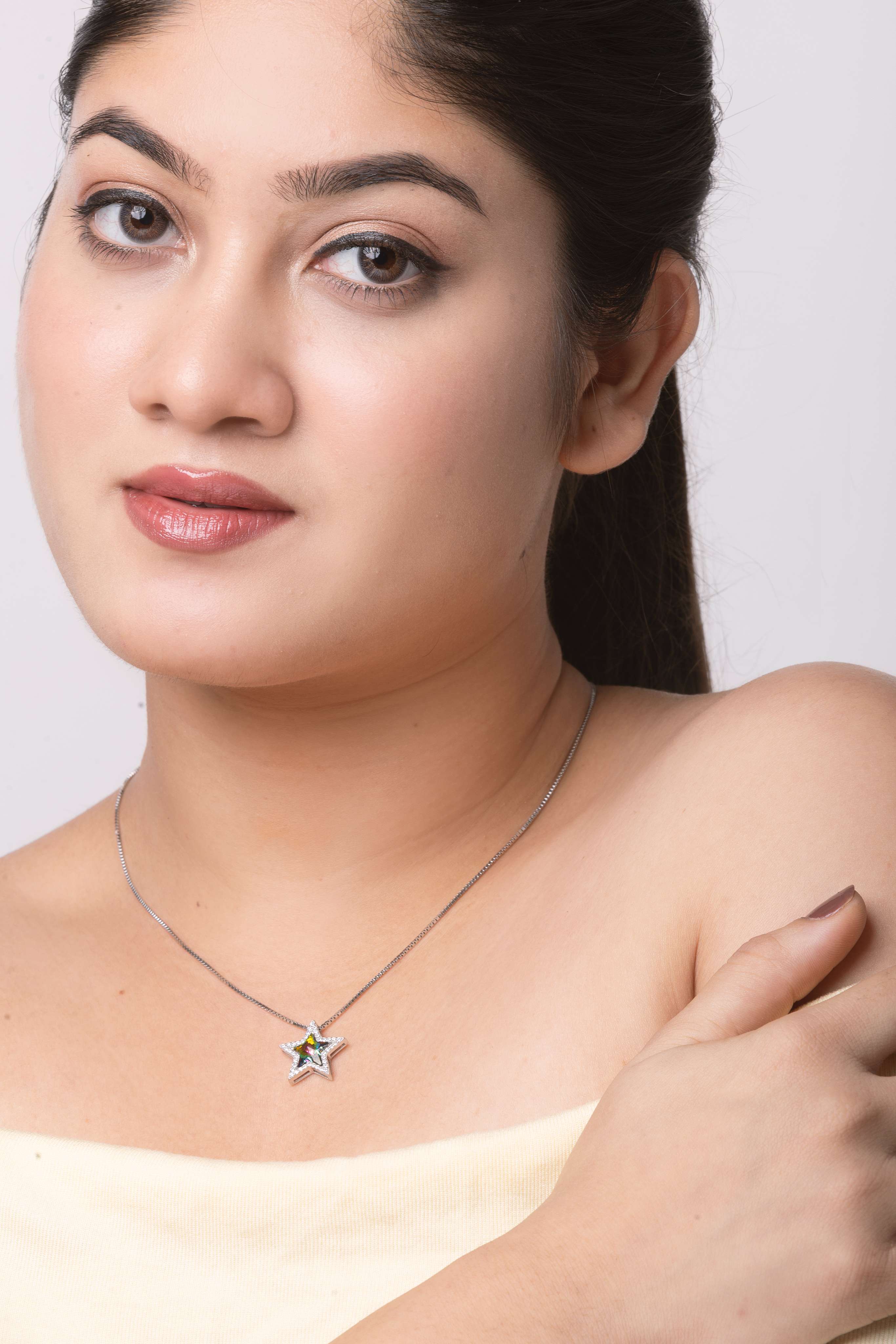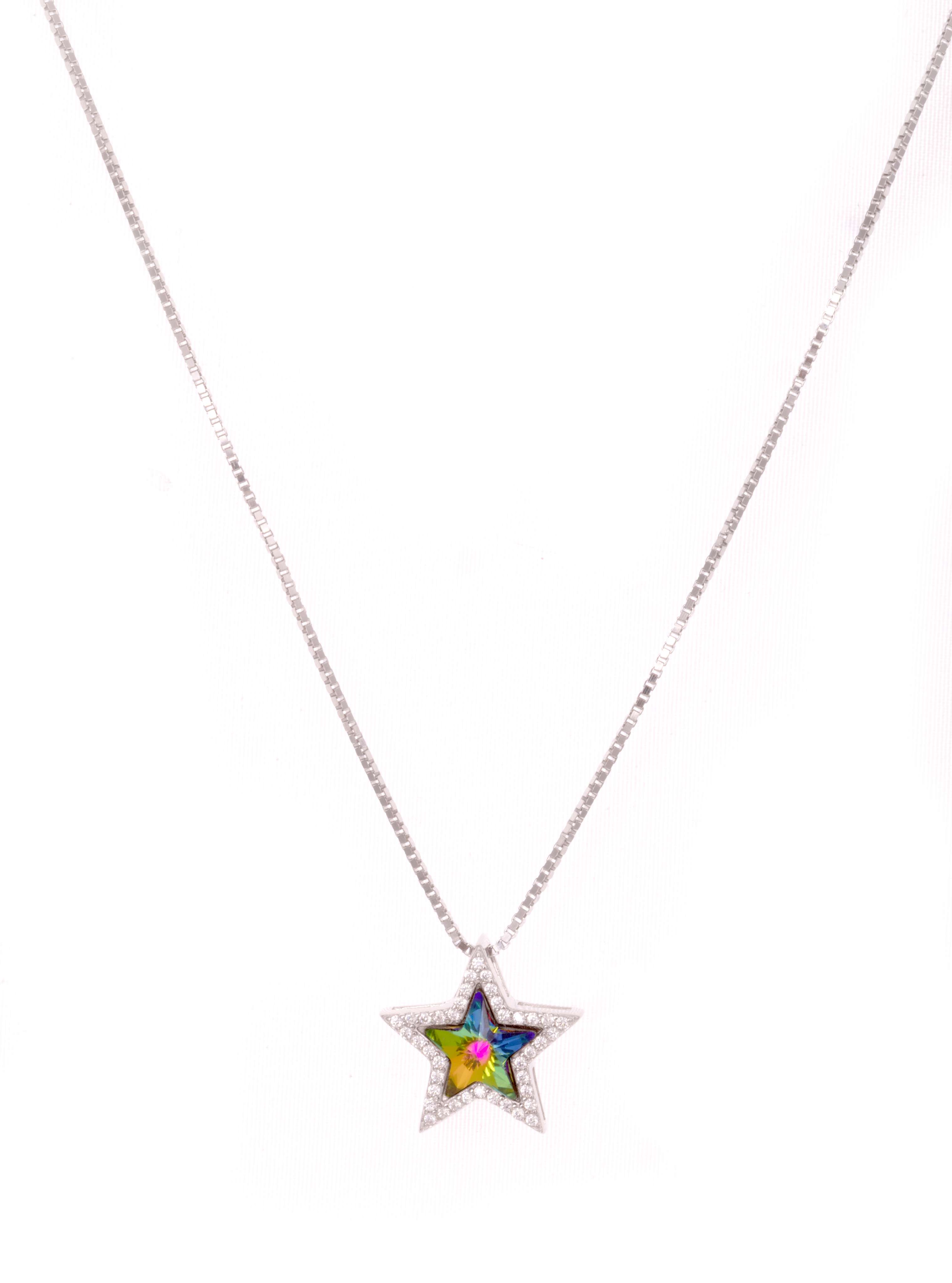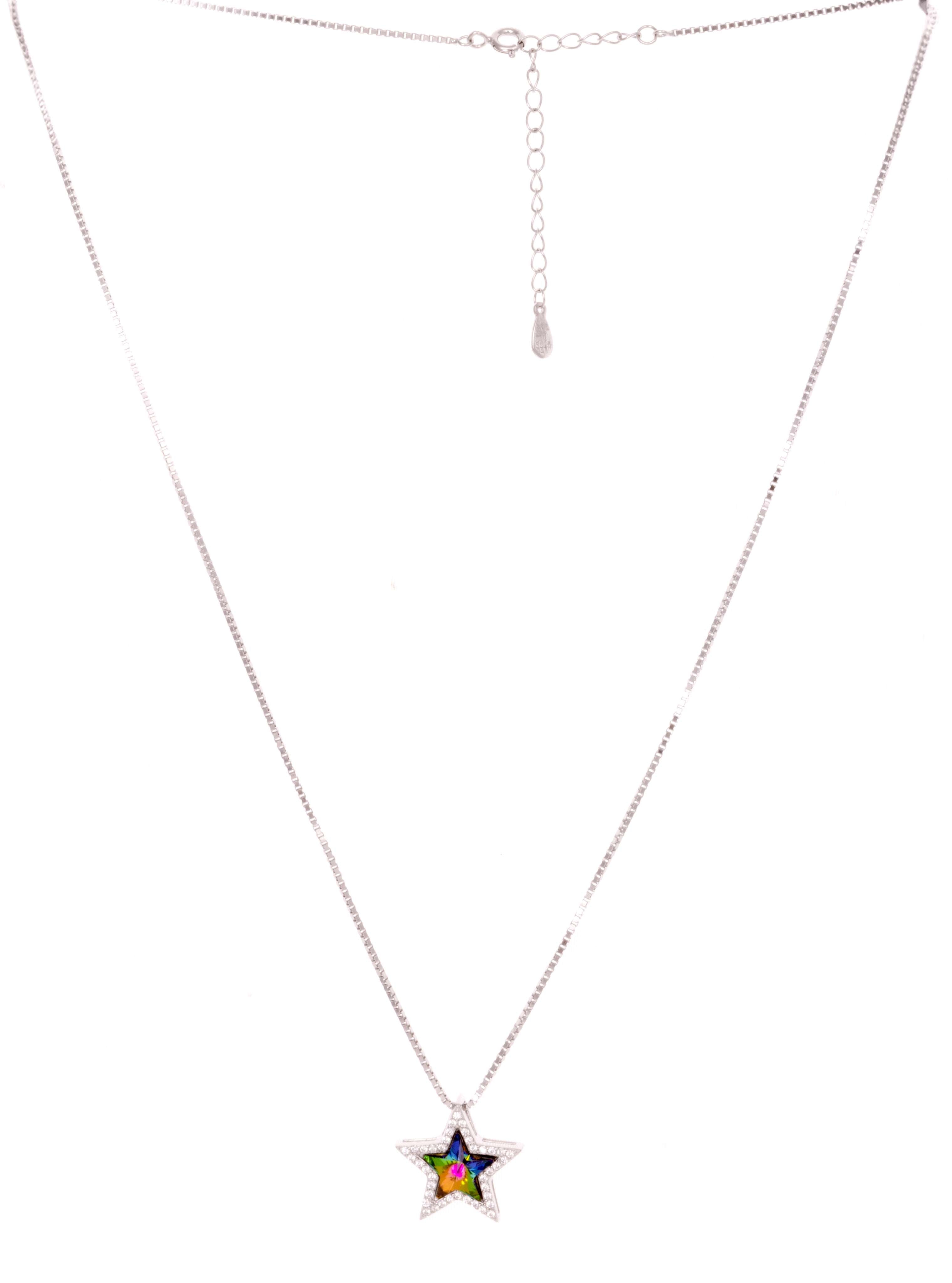 The Rainbow Radiance necklace features a sleek sterling silver chain with a captivating star-shaped pendant. The star's edge is adorned with zircons, framing a multifaceted crystal that shimmers with rainbow colors.