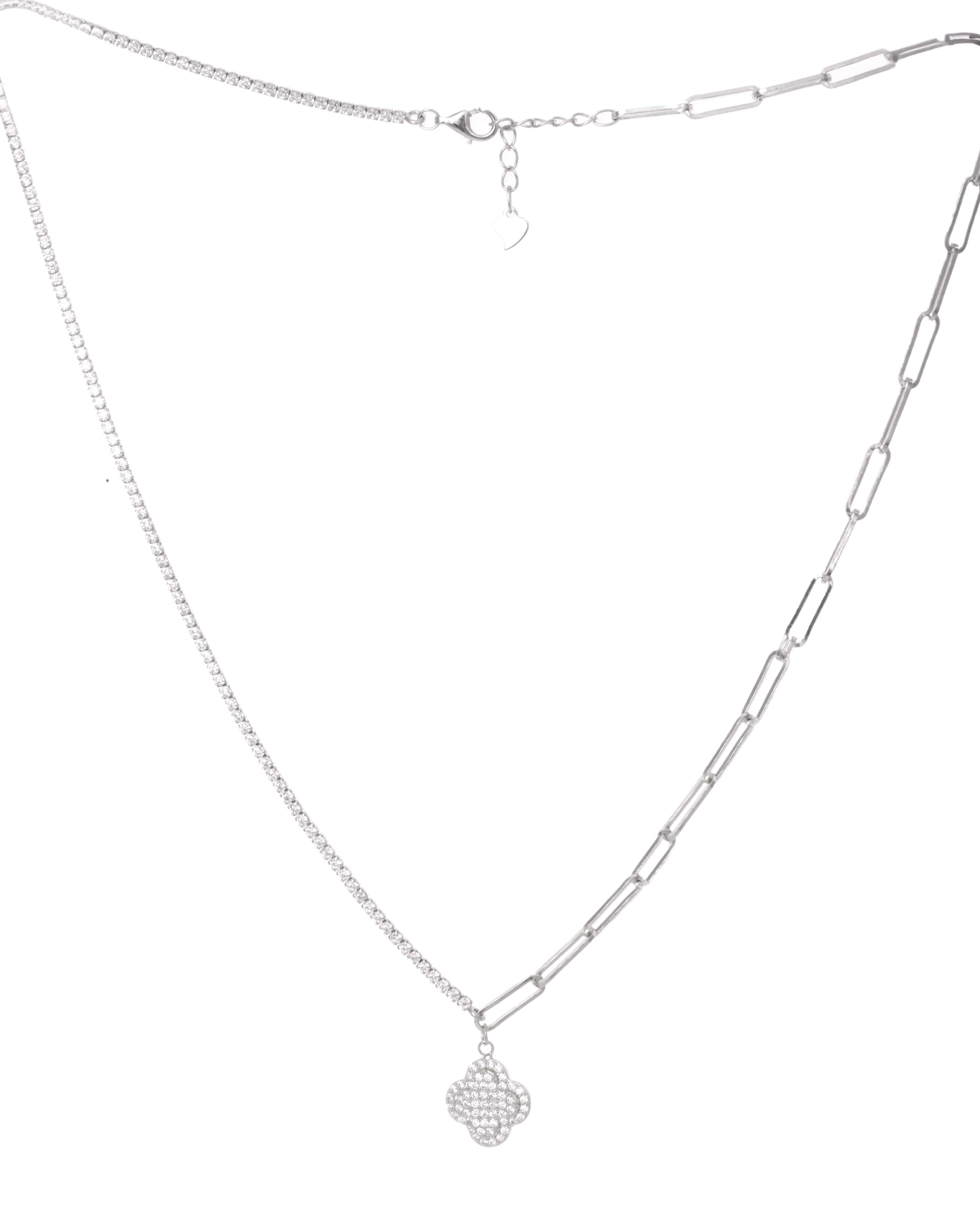 A bold fusion of elegance and edge — the Chain of Grace features a unique half-and-half design with one side adorned in classic tennis-style zircons and the other with statement link chains. Finished with a shimmering clover charm, this 92.5 sterling silver necklace redefines contemporary chic.