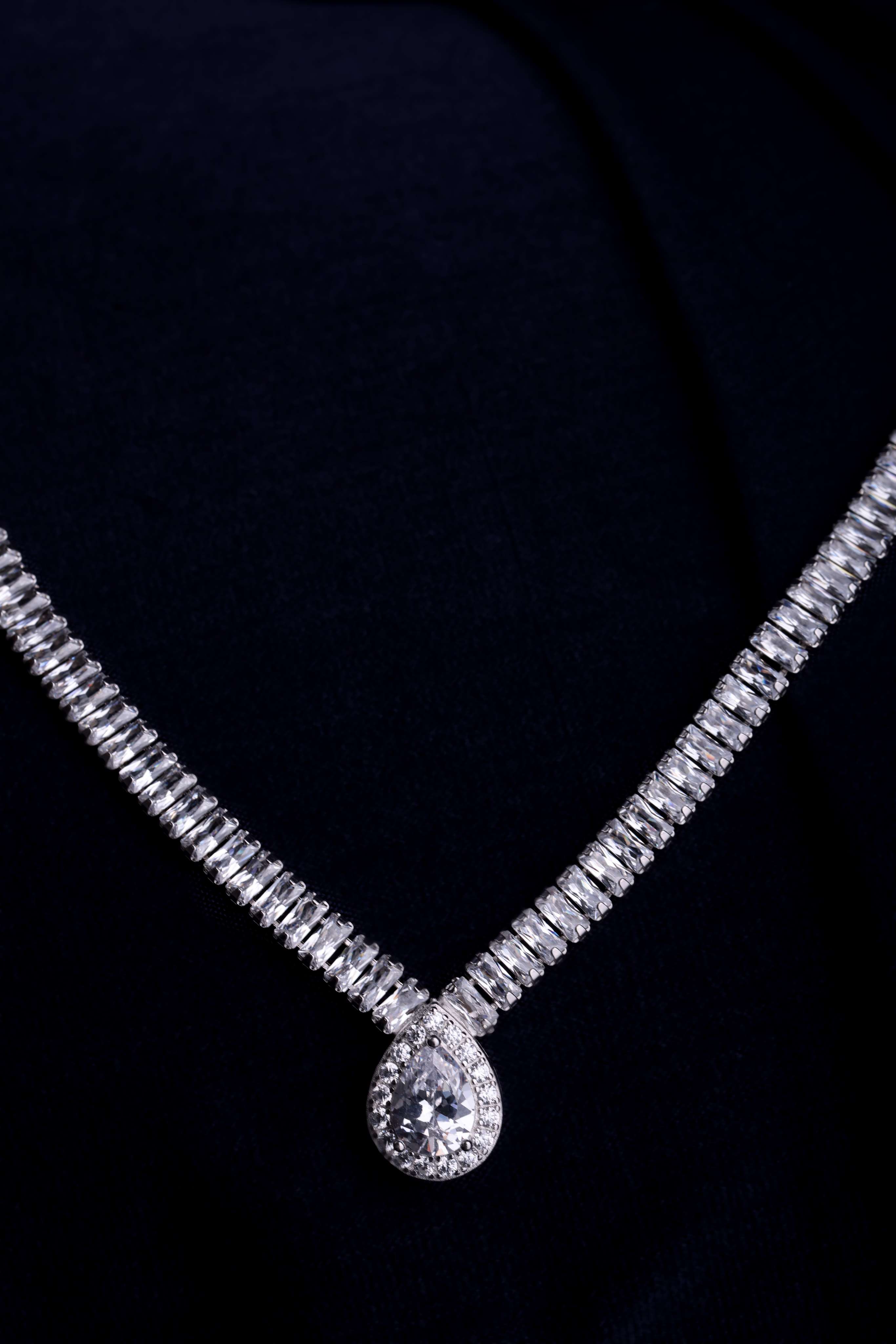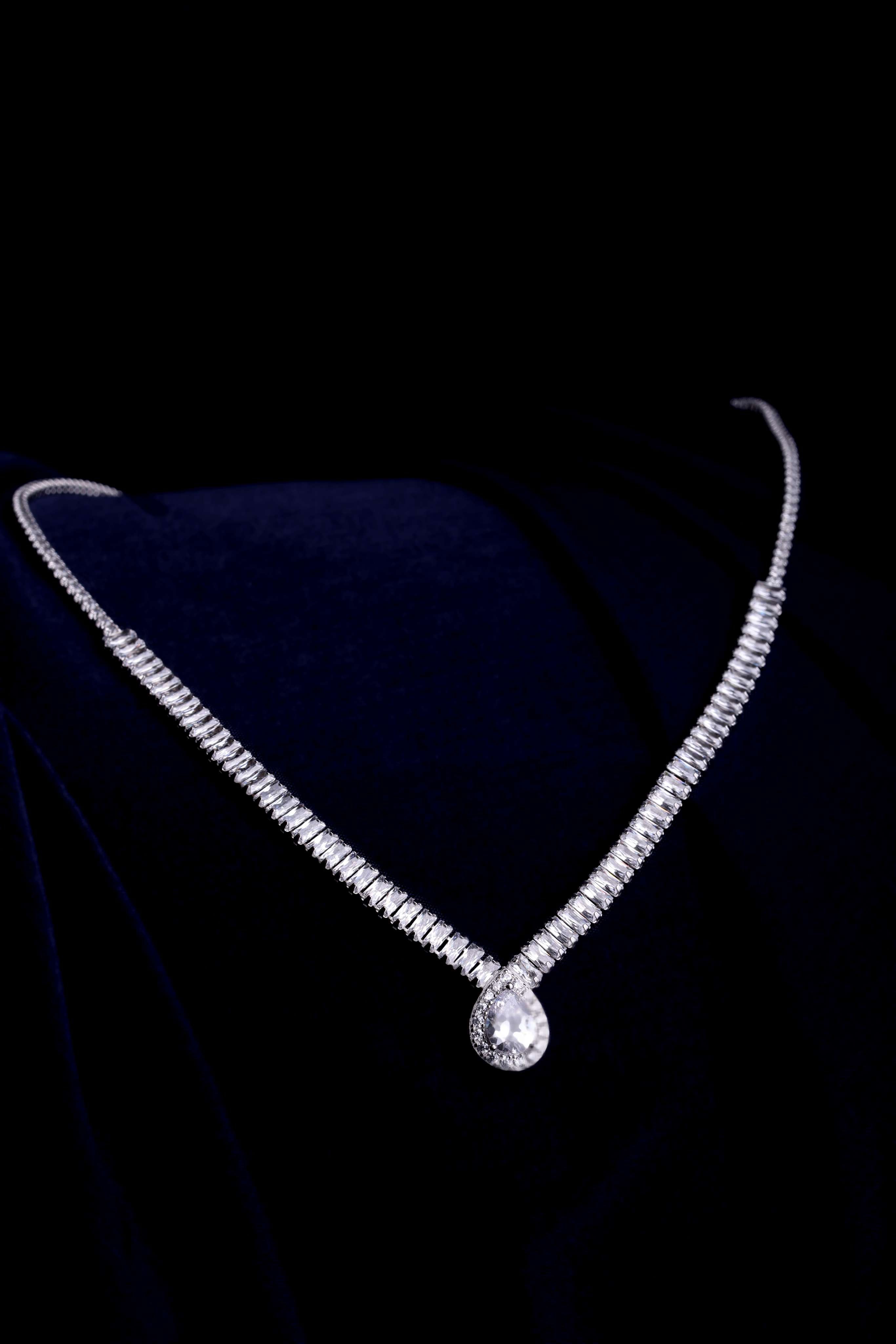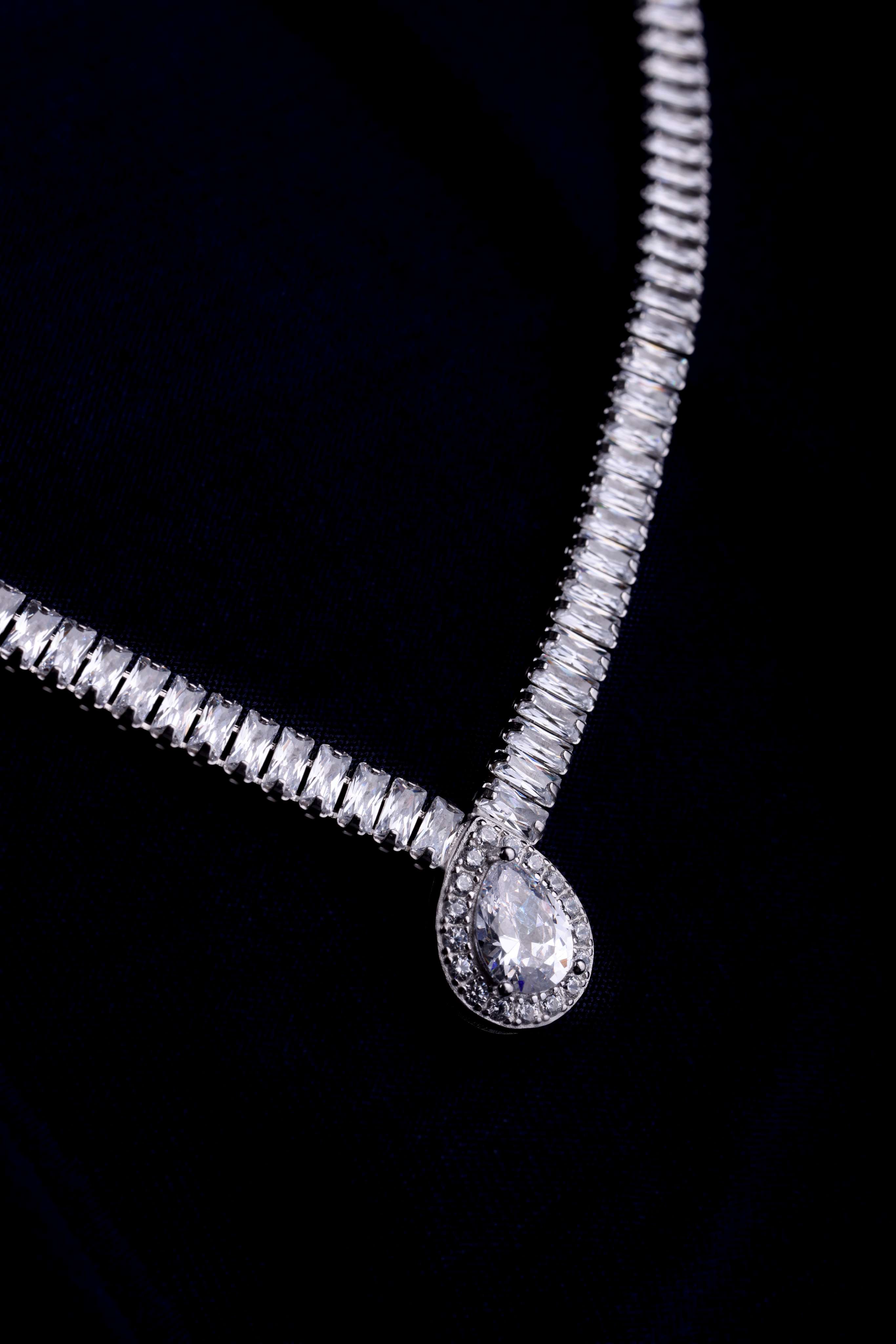 A continuous zircon chain ending in a pear-shaped drop — mimicking the sparkle of morning dew.