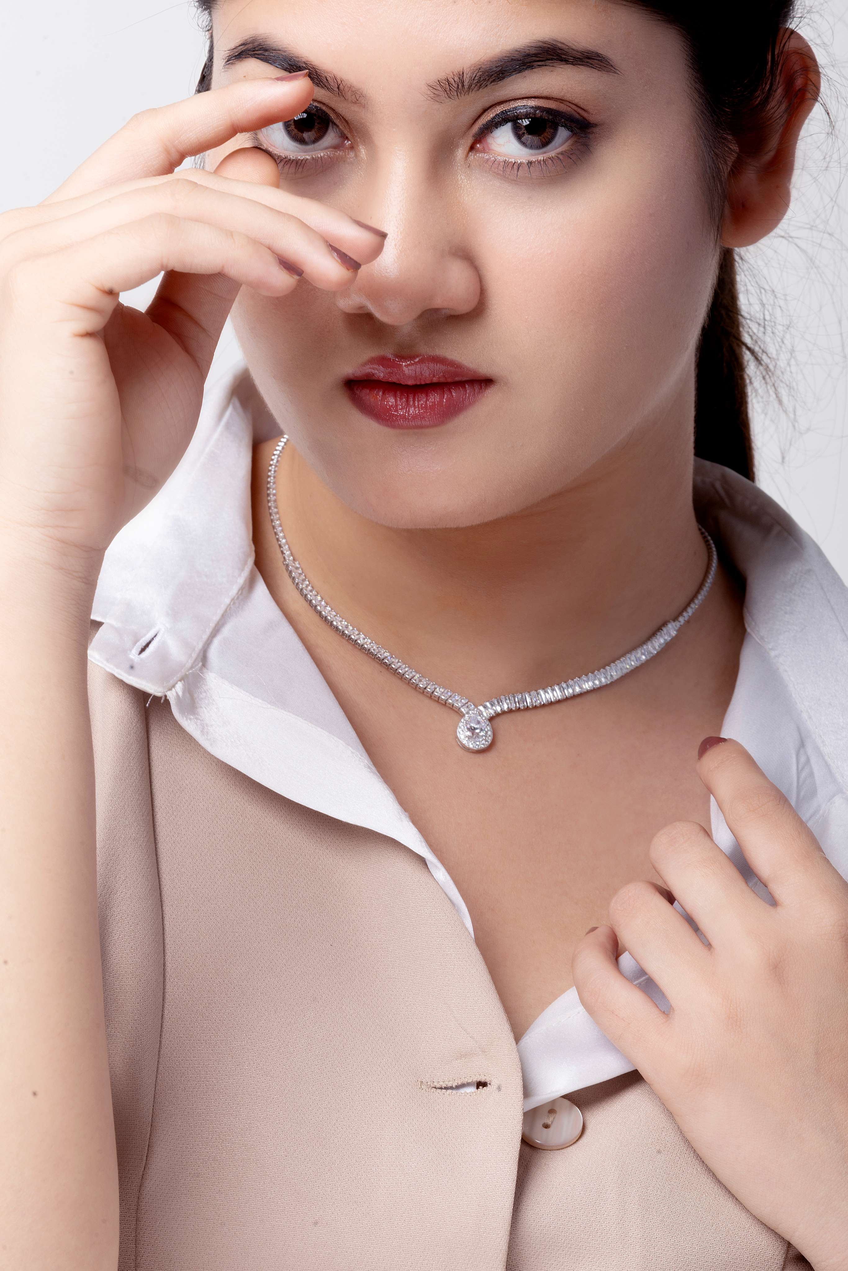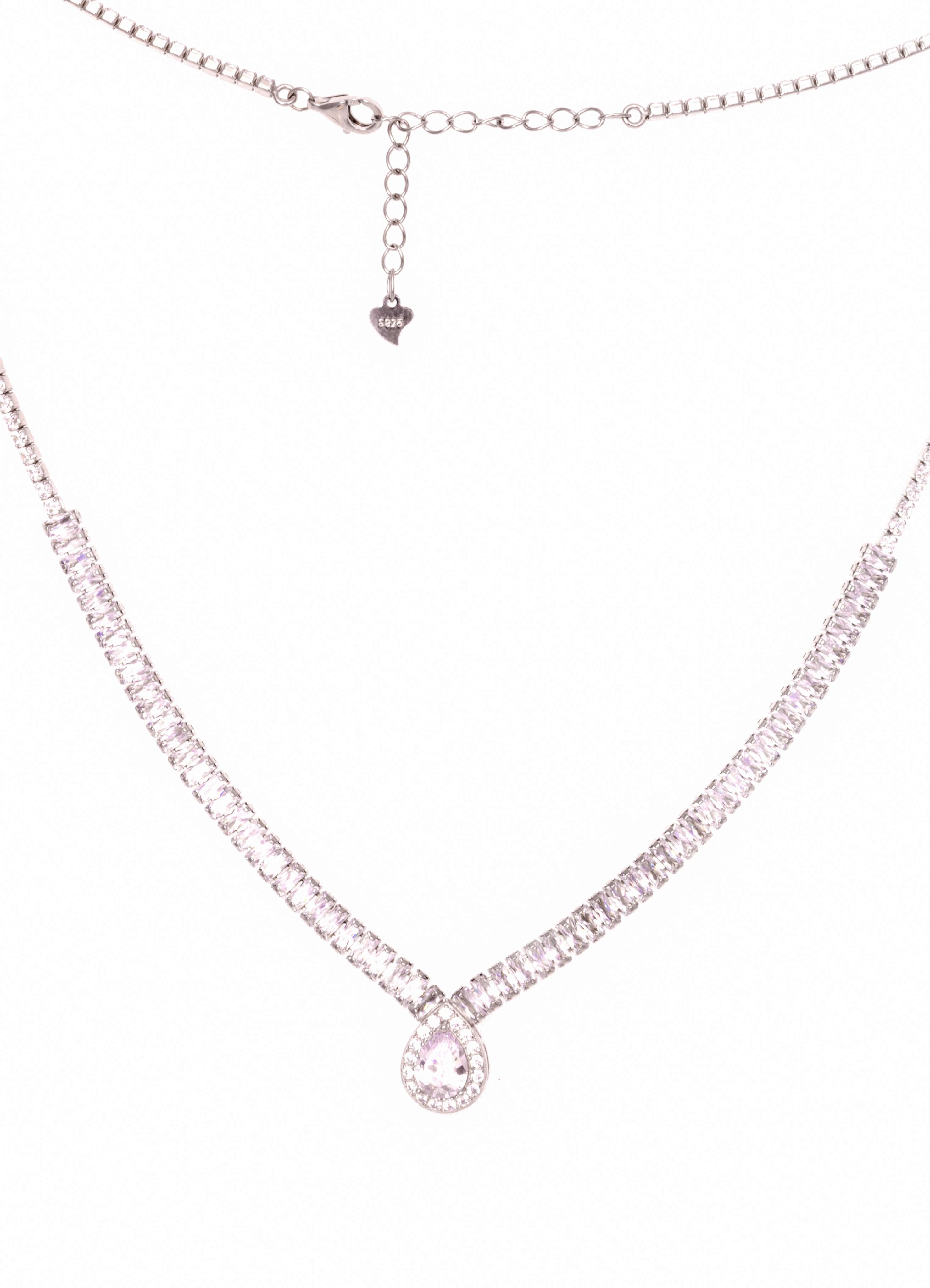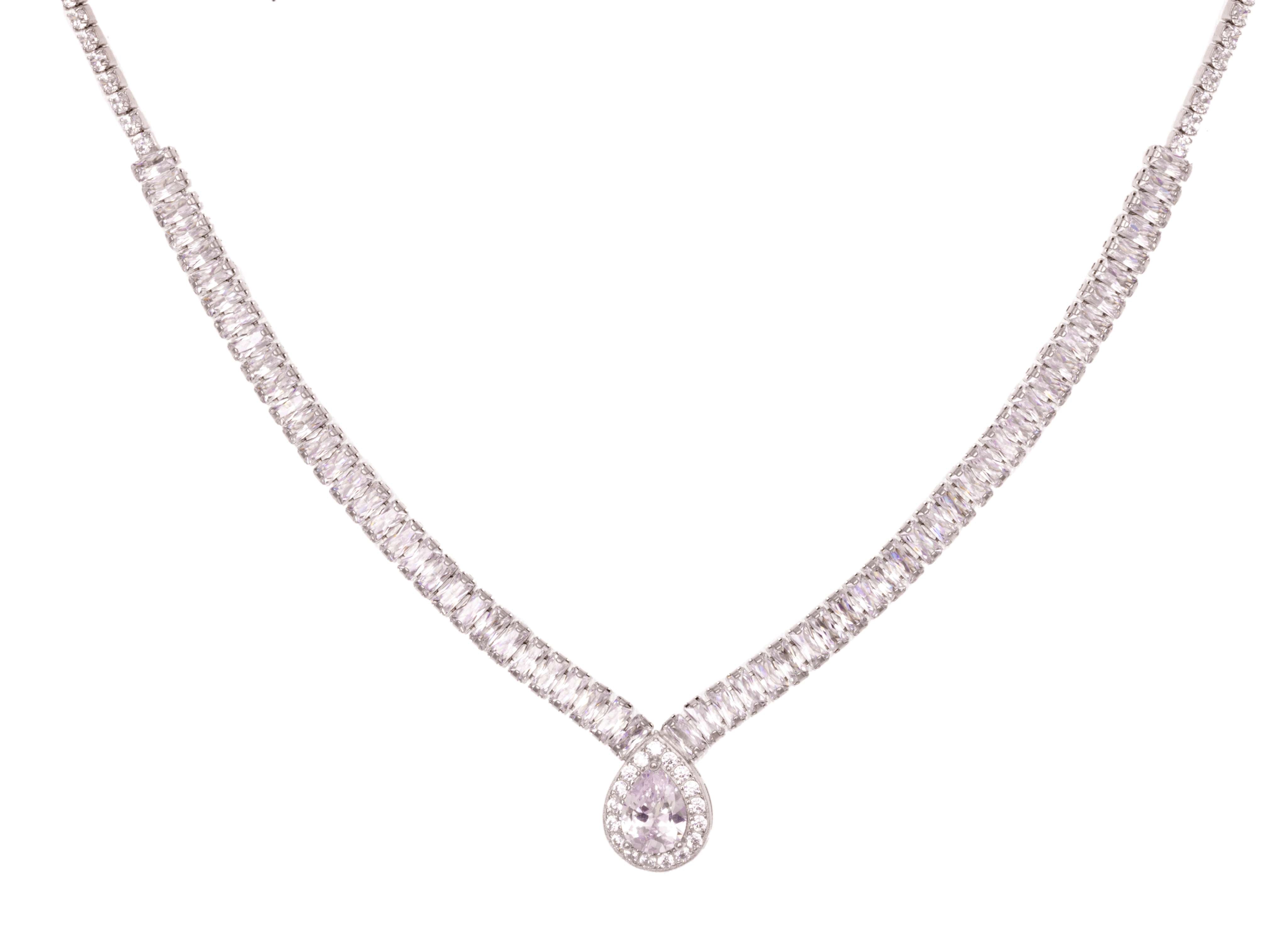 A continuous zircon chain ending in a pear-shaped drop — mimicking the sparkle of morning dew.