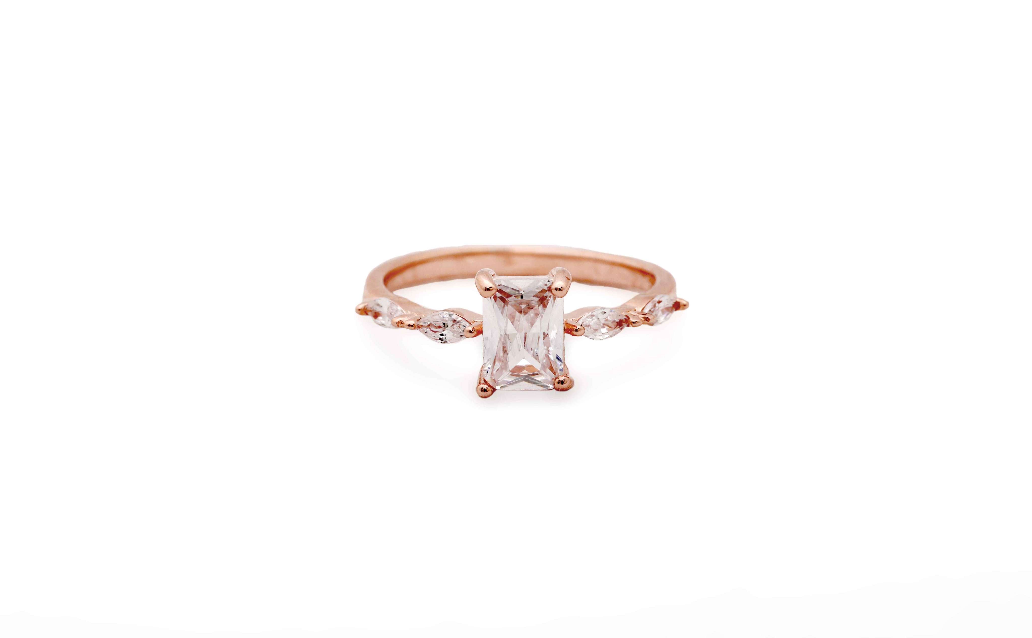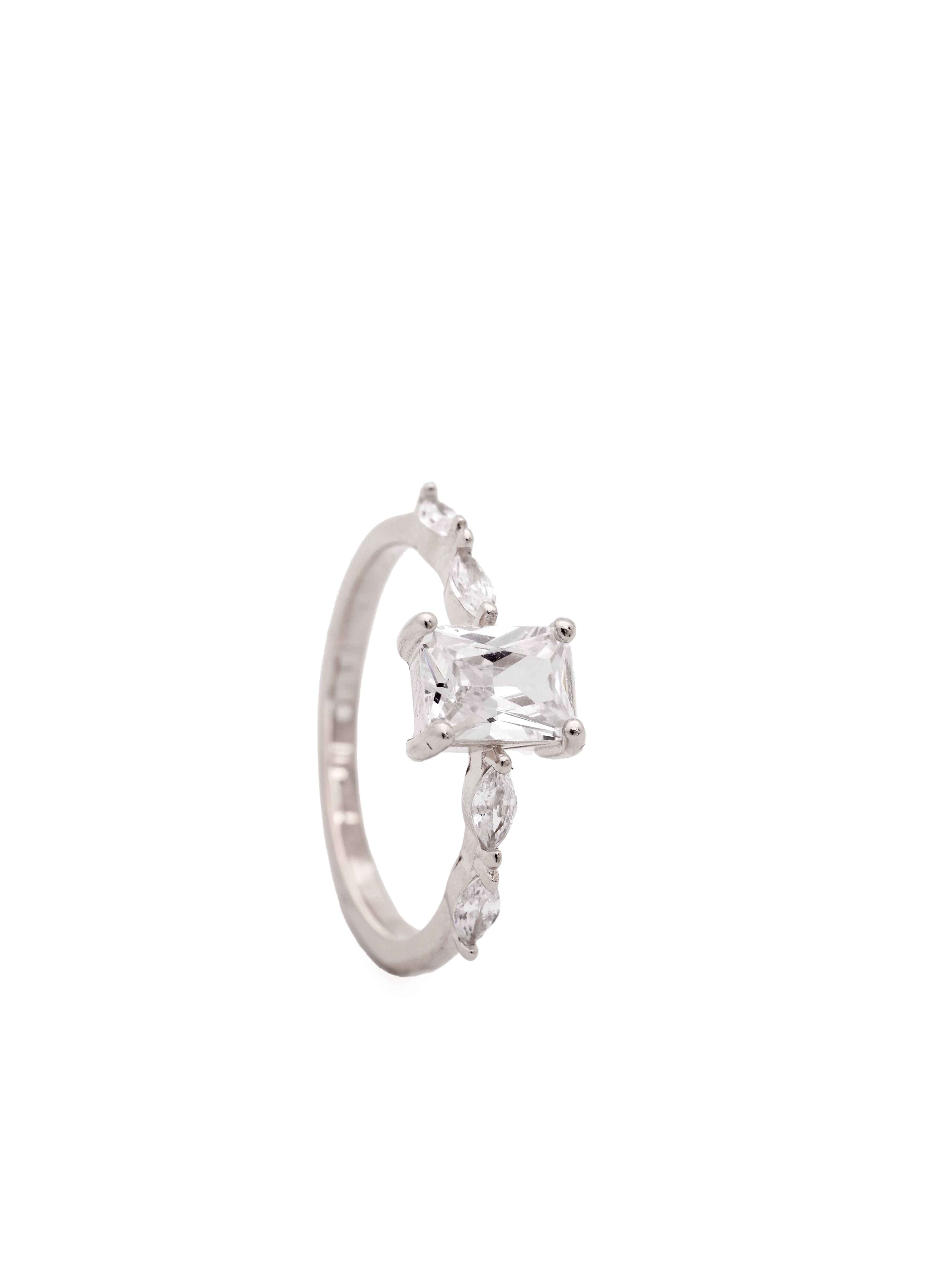 Introducing our Radiant Prism Ring, crafted in 92.5 sterling silver for timeless elegance. A rectangular cubic zirconia centerpiece, flanked by smaller gemstones, exudes classic sophistication.