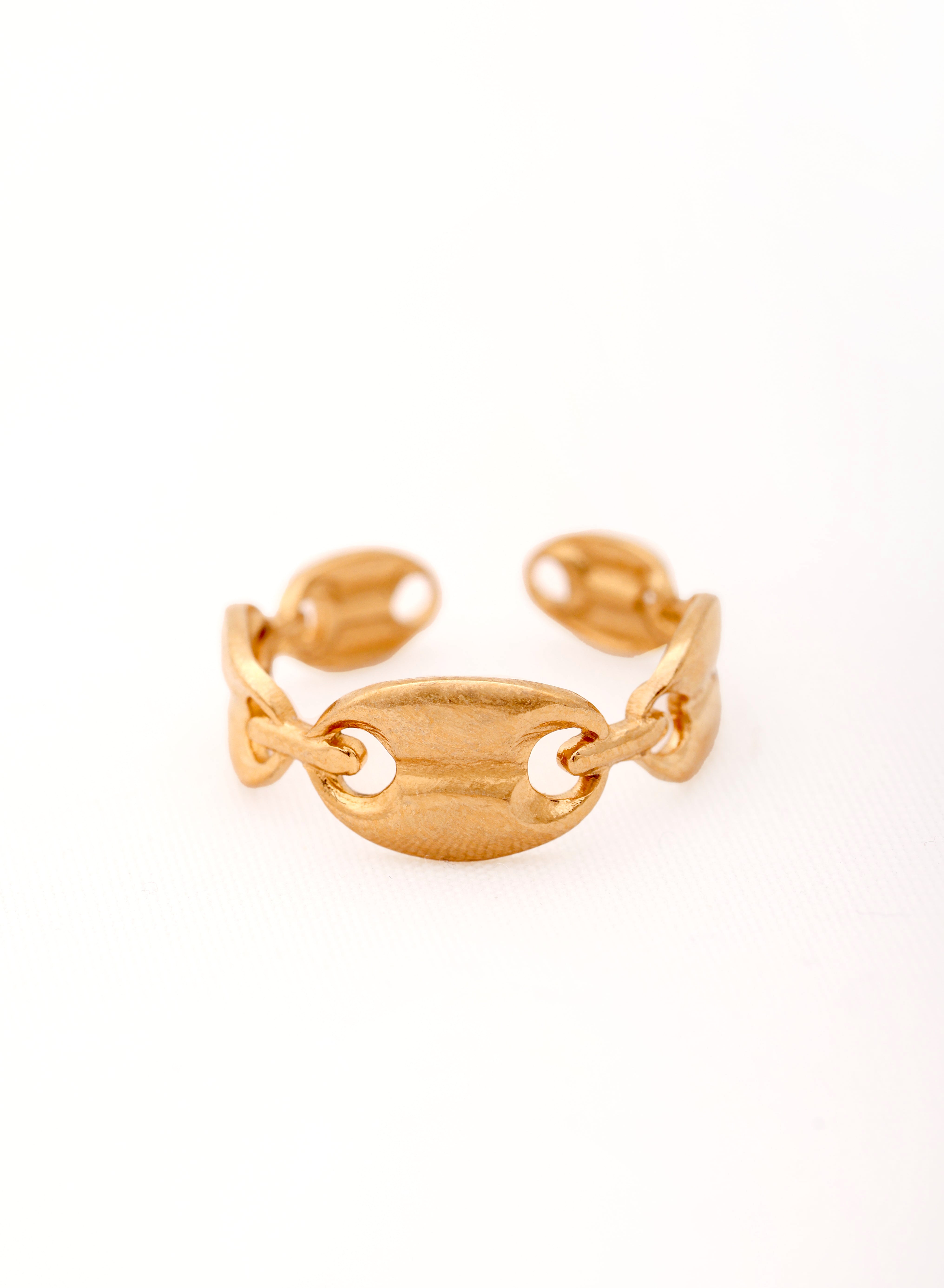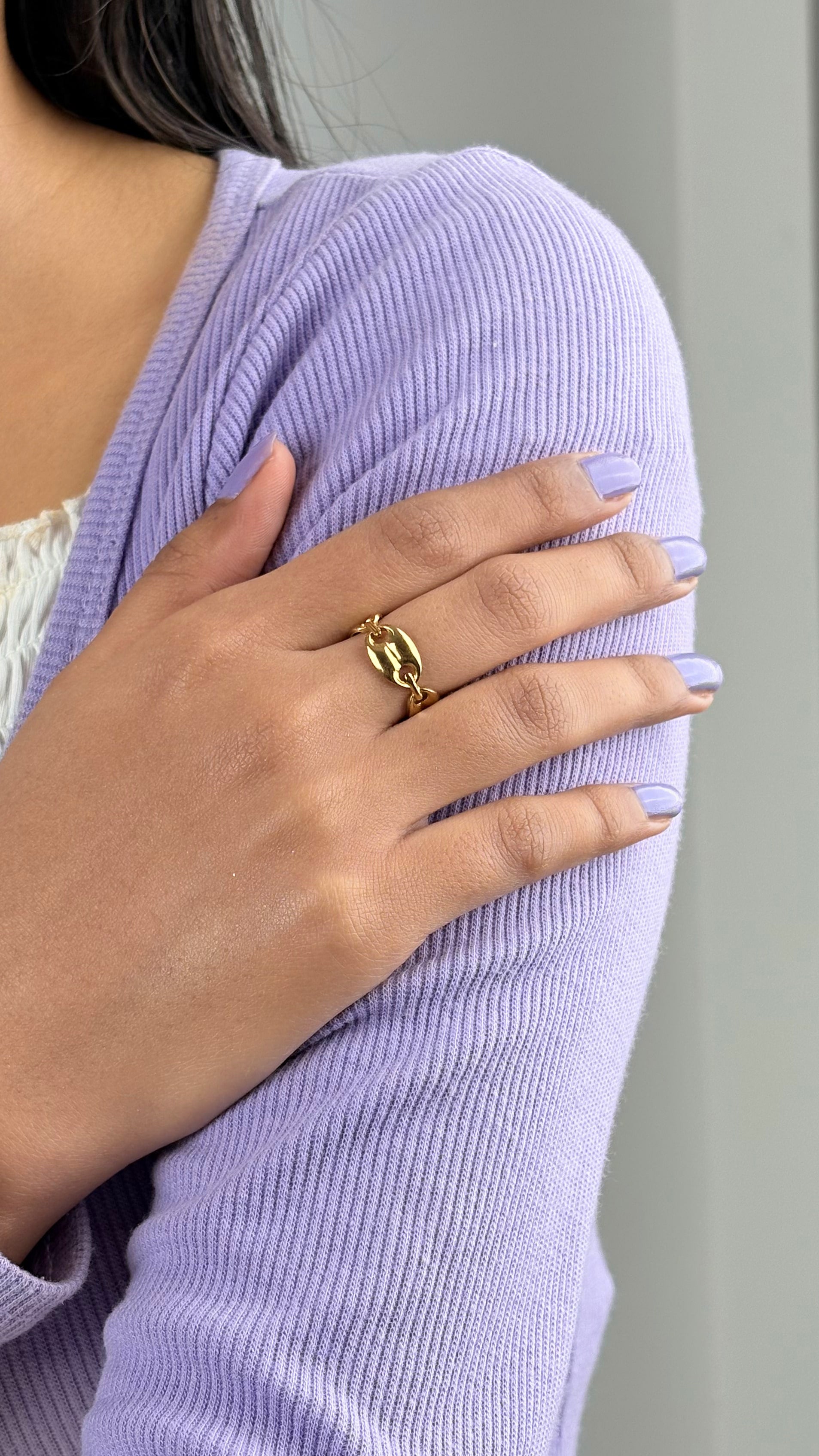 Add a dash of sophistication with the Eterna Chain Ring, showcasing a chic, linked design made from stainless steel and finished with a glowing 18k gold plating. Built to be water-proof and anti-tarnish, this ring stays stunning without any effort.