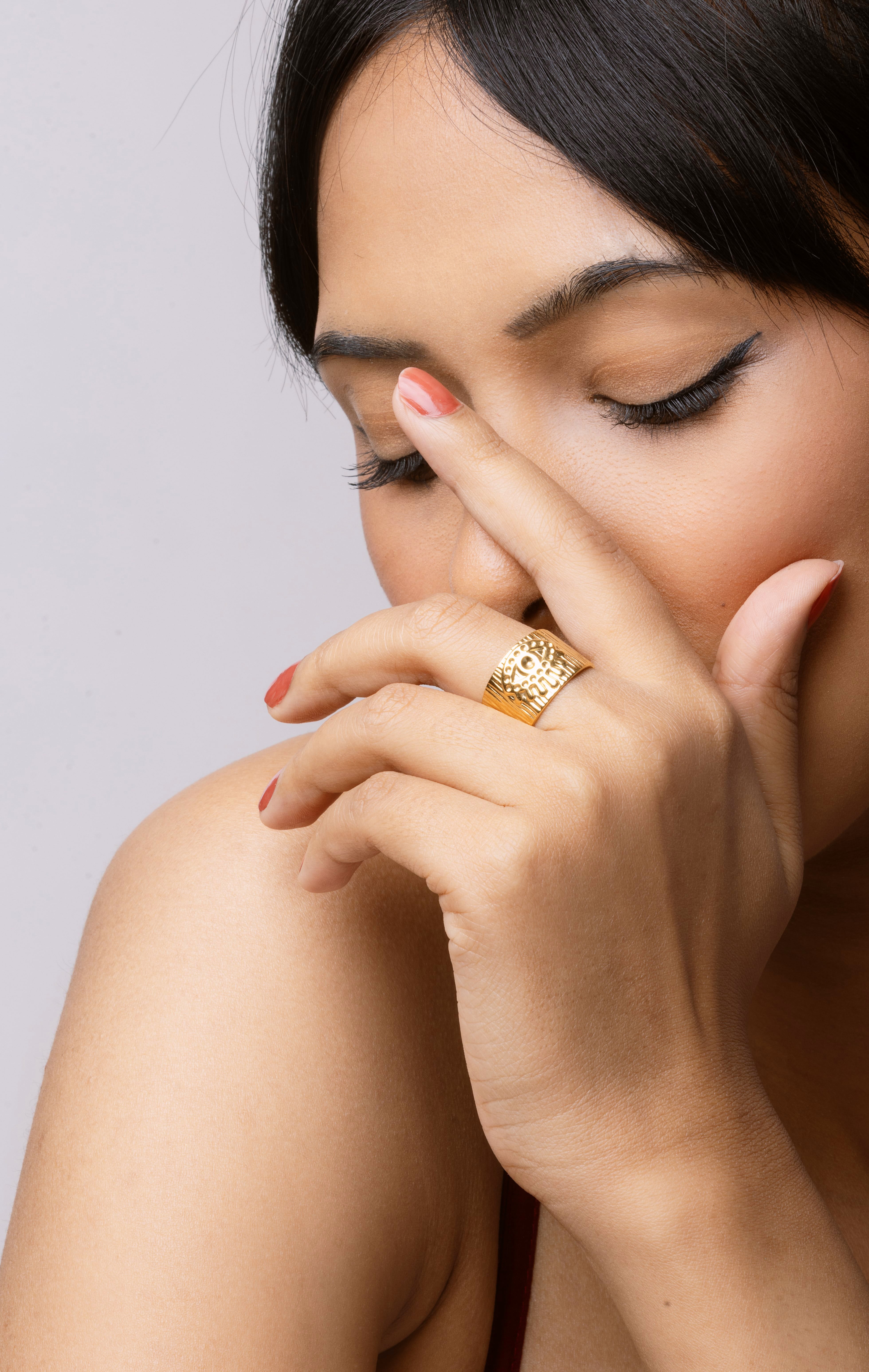 Make a statement with the Celestial Guardian Ring, featuring an intricate eye motif crafted from stainless steel and plated in radiant 18k gold. This bold ring is water-proof and anti-tarnish, ensuring a lasting shine with minimal care.