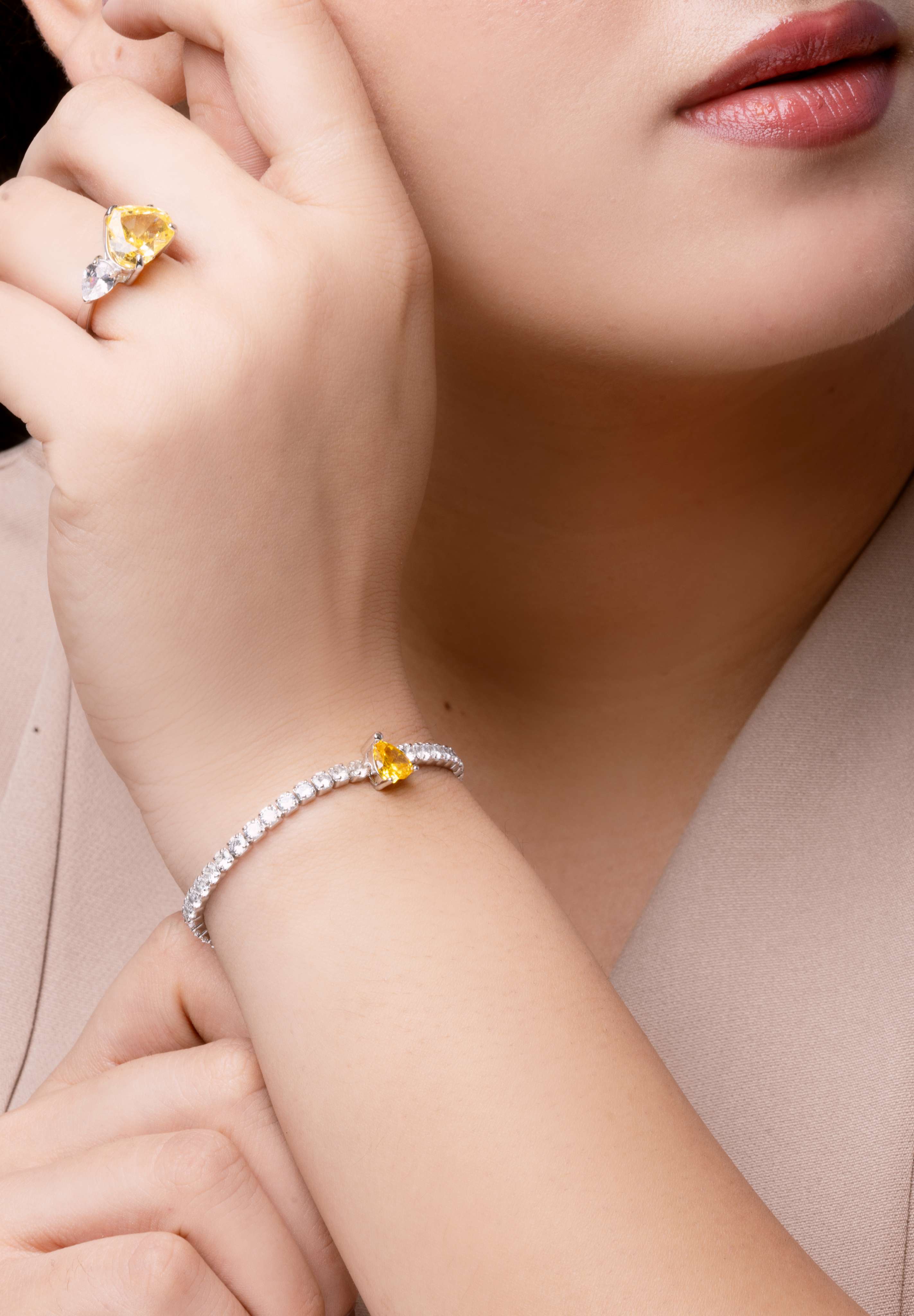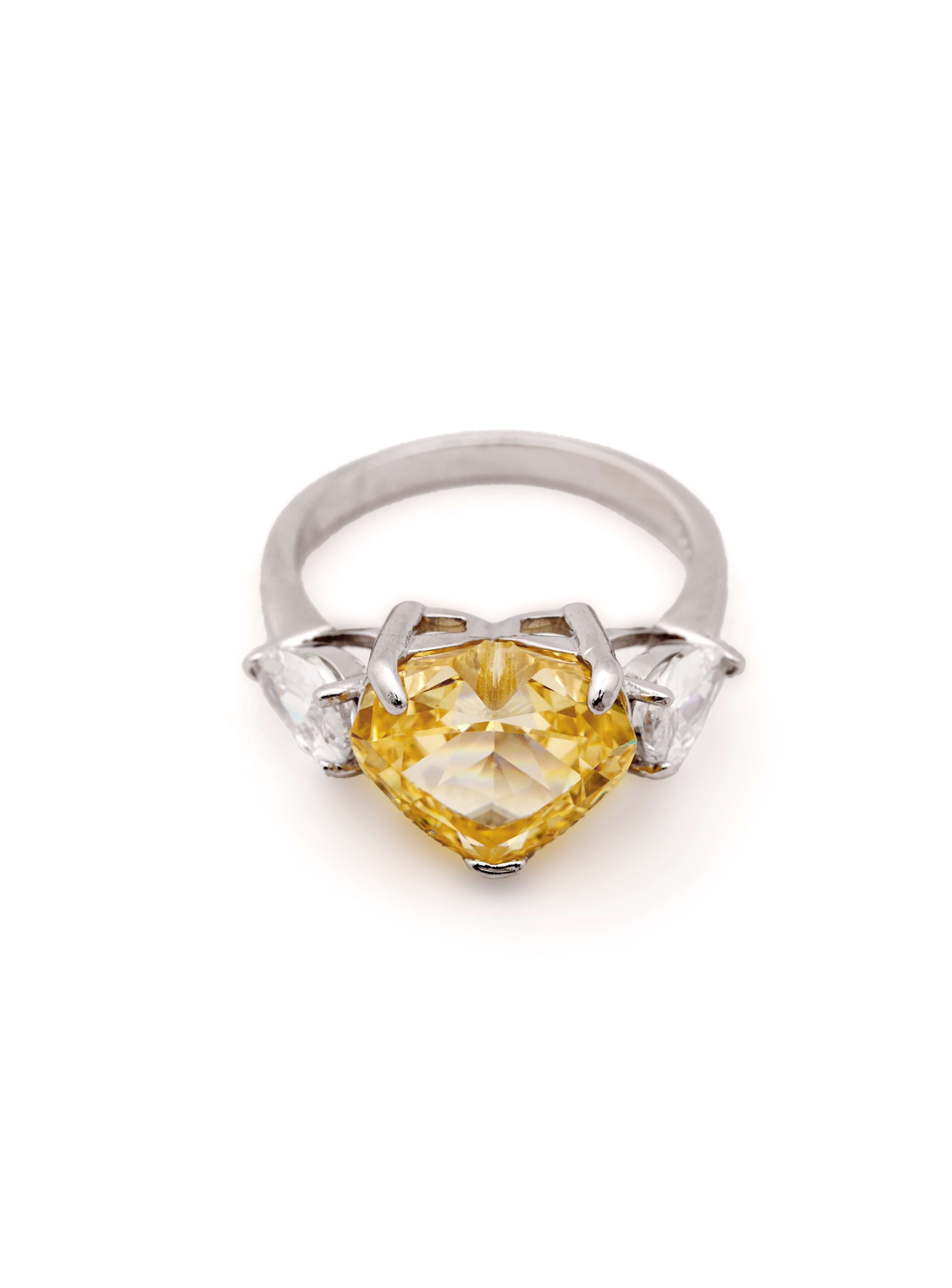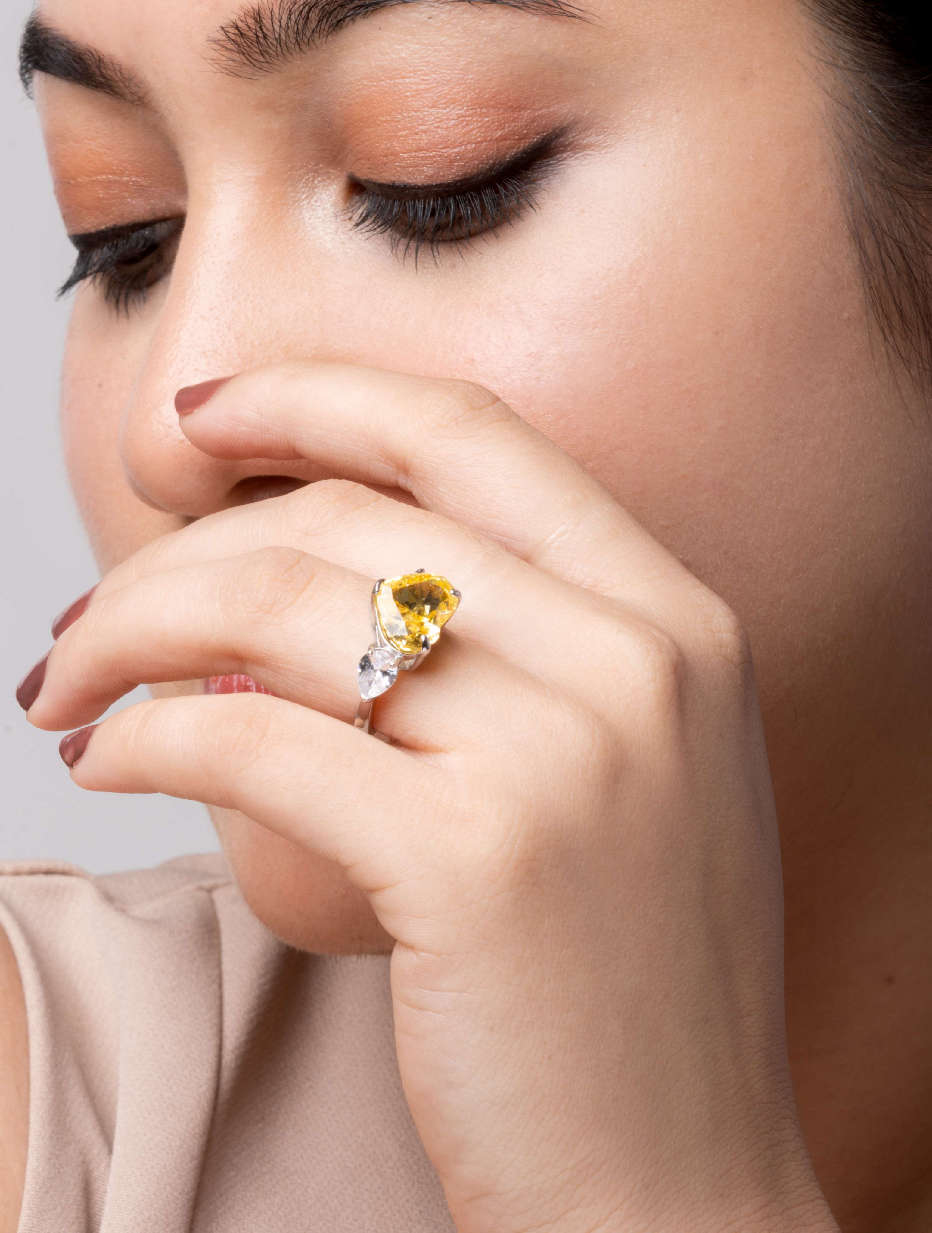 Heart-shaped yellow zircon with pear-cut white stones on a silver ring.