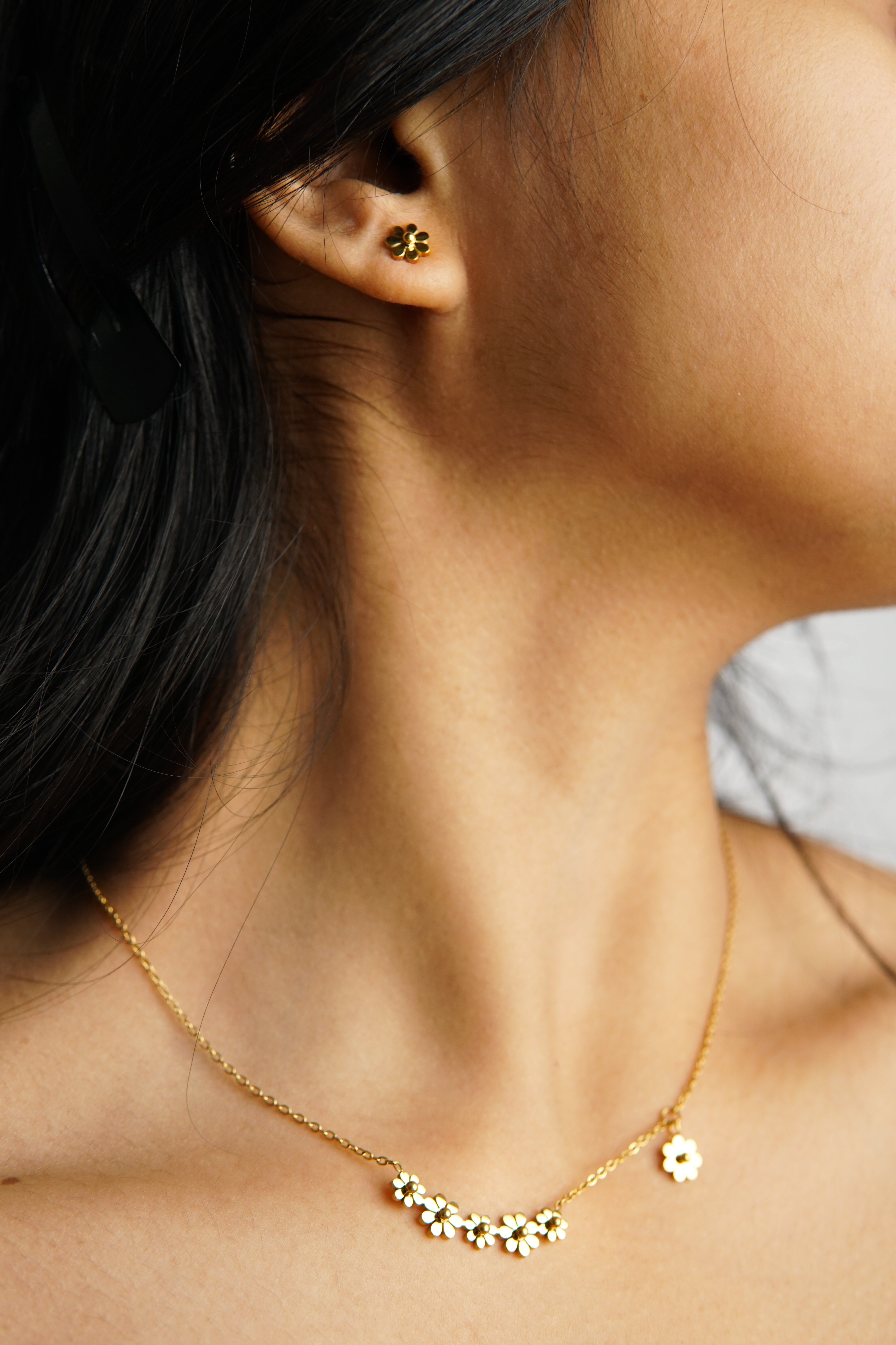 The Design Philosophy: Elevate your style with the Daisy Blossom Set from Aventara, featuring a delicate necklace and stud earrings crafted from 18k gold-plated stainless steel, water-proof and anti-tarnish for lasting shine.