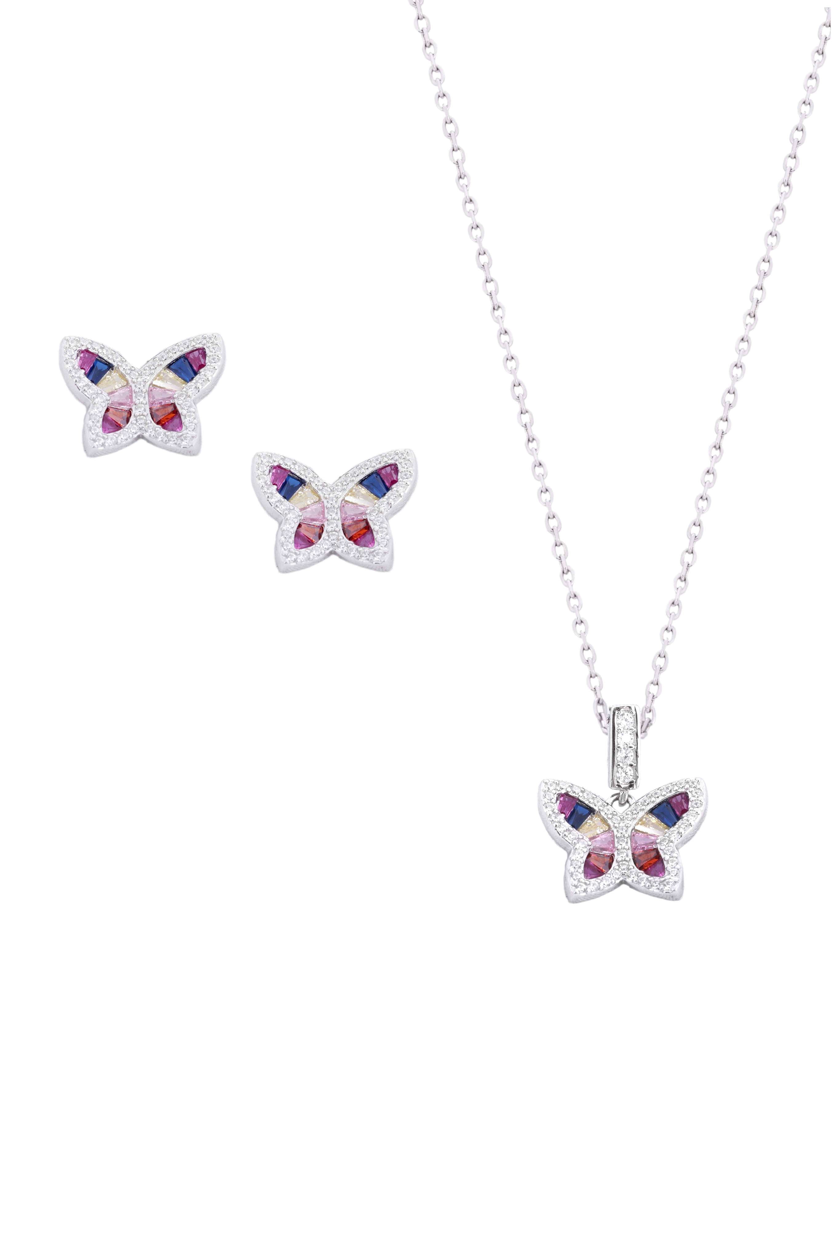 Light, playful, and full of grace—the Aurora Butterfly Pendant Set from Aventara brings nature’s delicate beauty to life. Crafted in 92.5 sterling silver and set with a mosaic of vibrant, baguette-cut stones, butterfly symbolizes transformation and the strength of femininity.