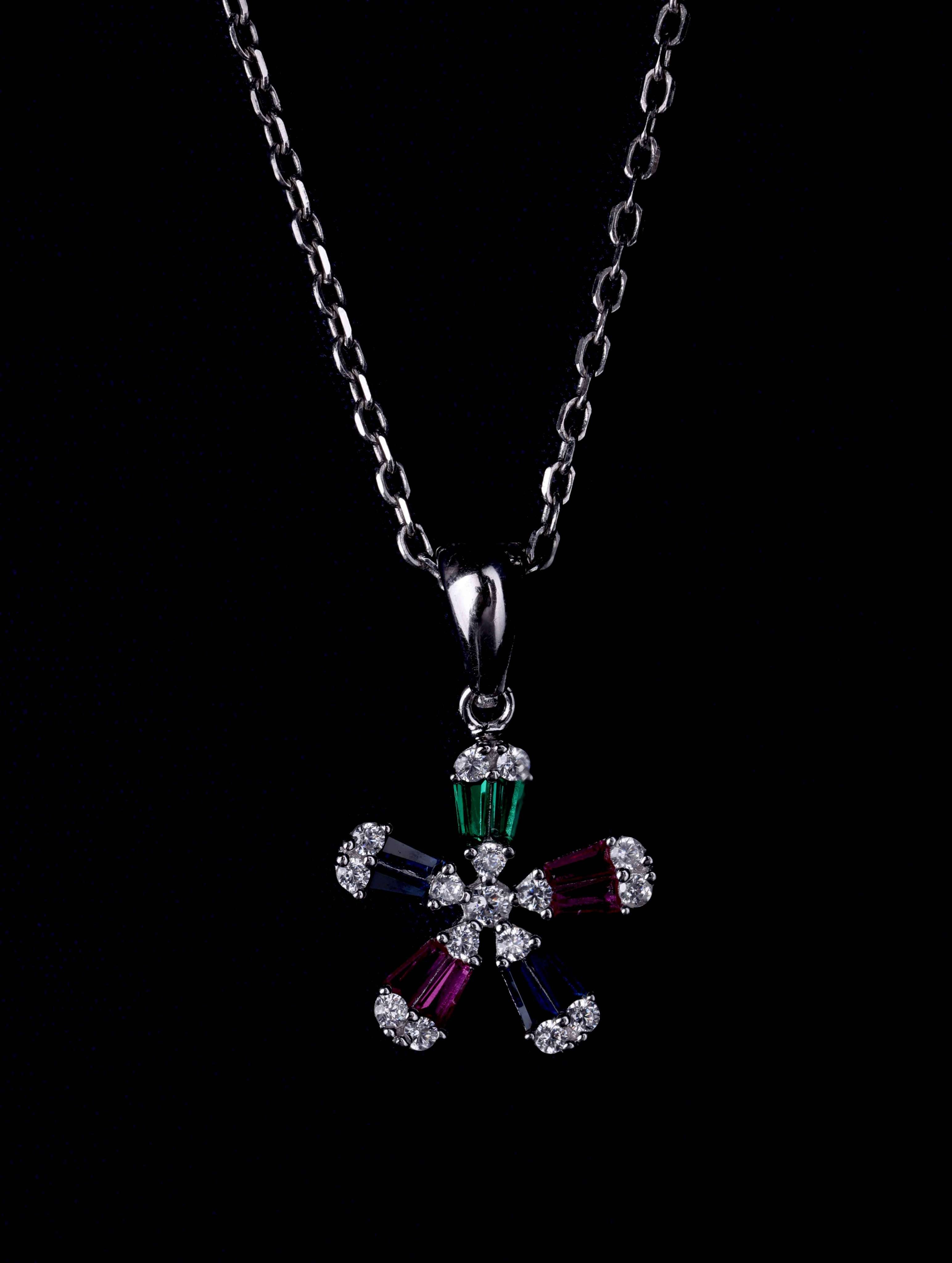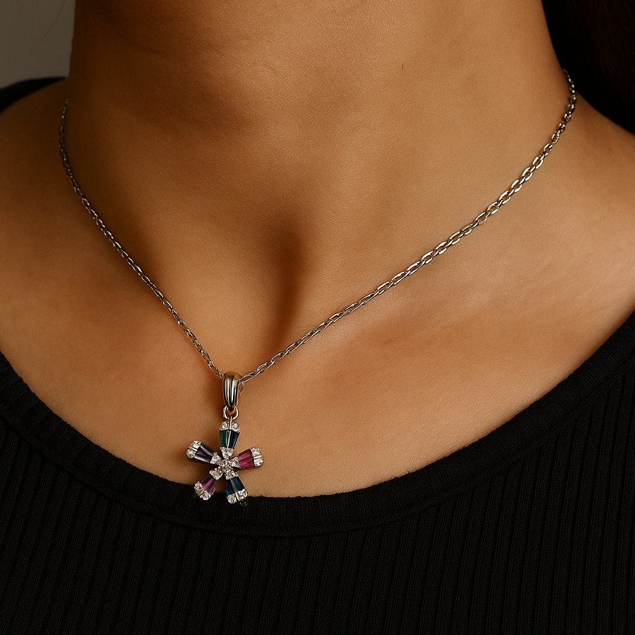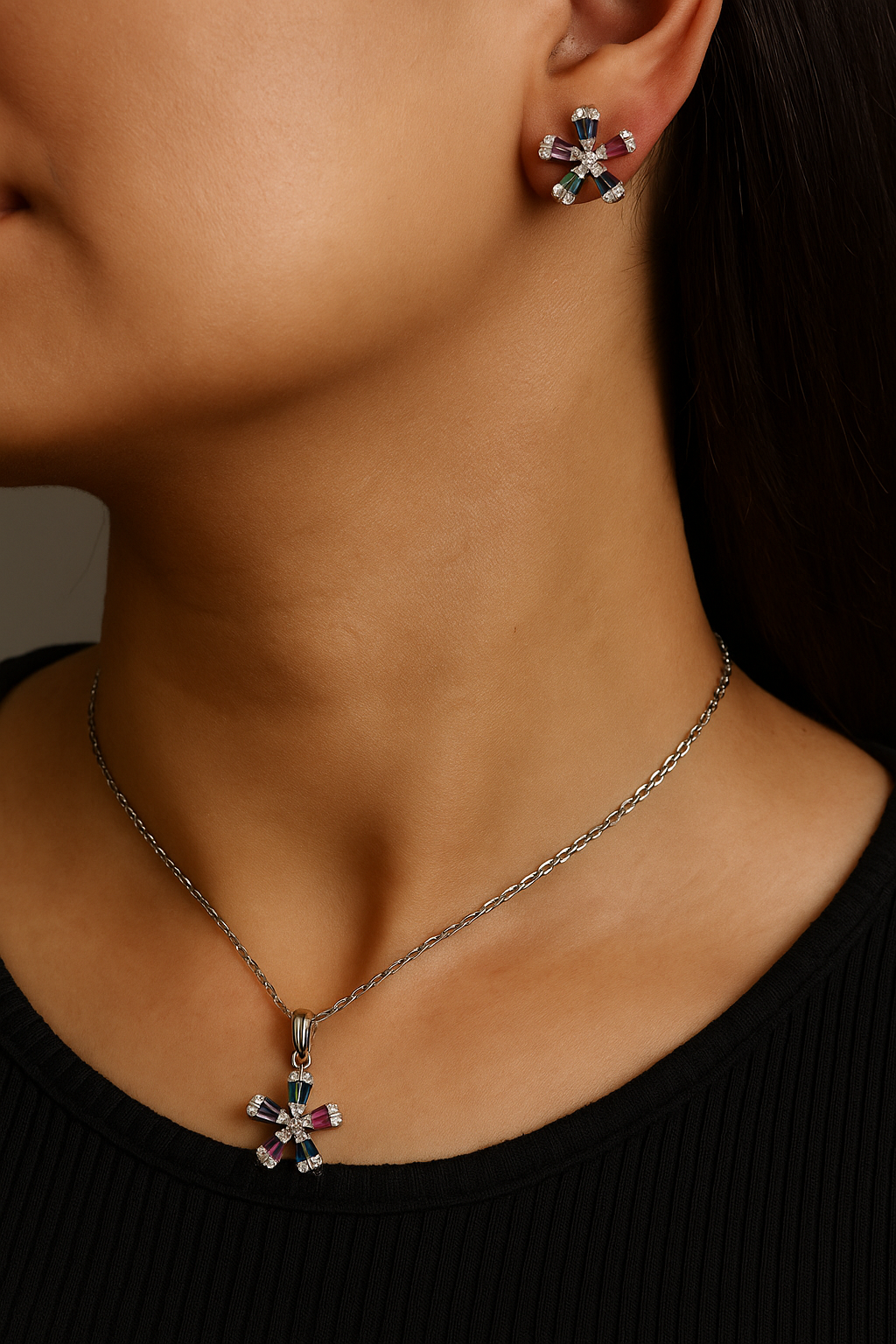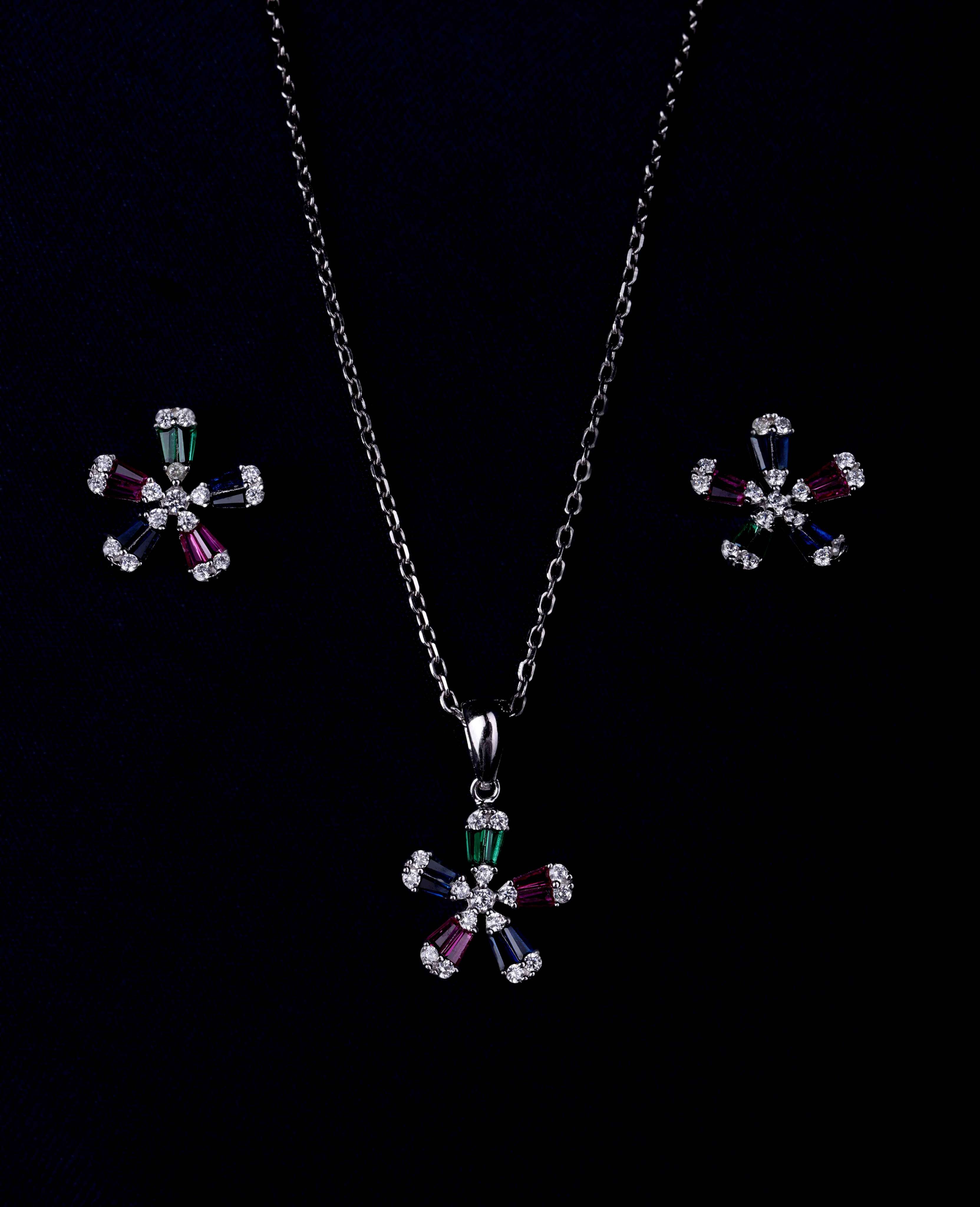 Timeless elegance meets floral charm in the Celeste Bloom Pendant Set from Aventara. Crafted in 92.5 sterling silver, this radiant design features an open flower motif, fully adorned entirely with baguette-cut stones—each petal reflecting light with graceful brilliance.