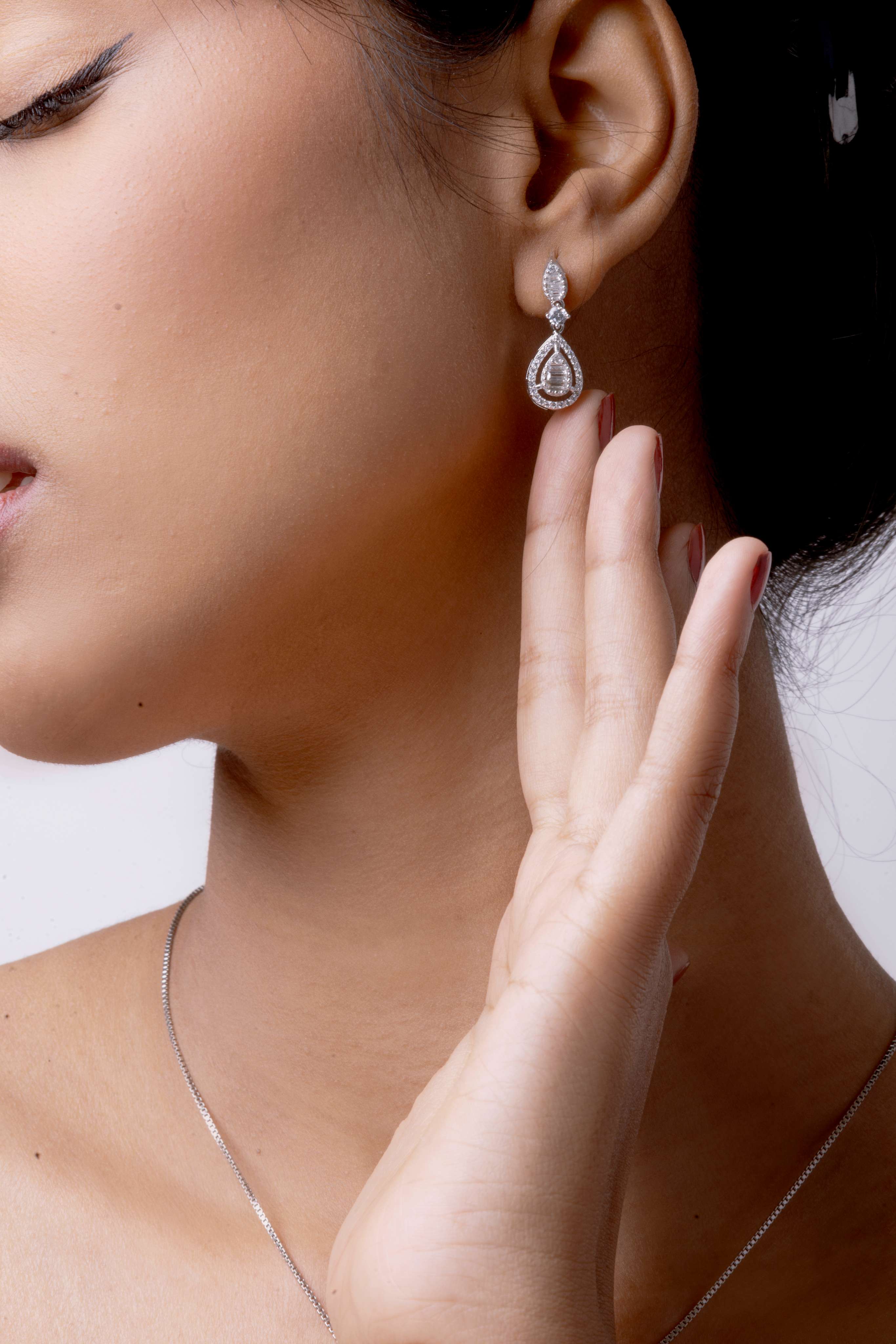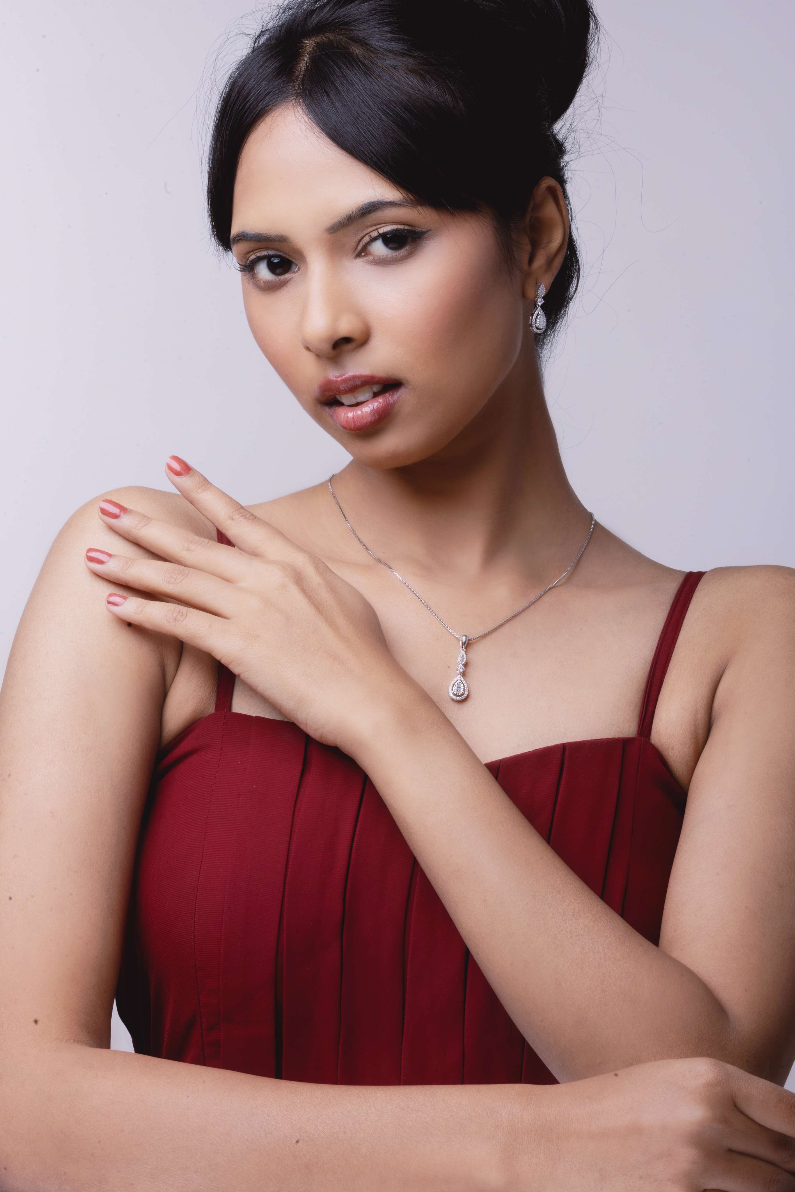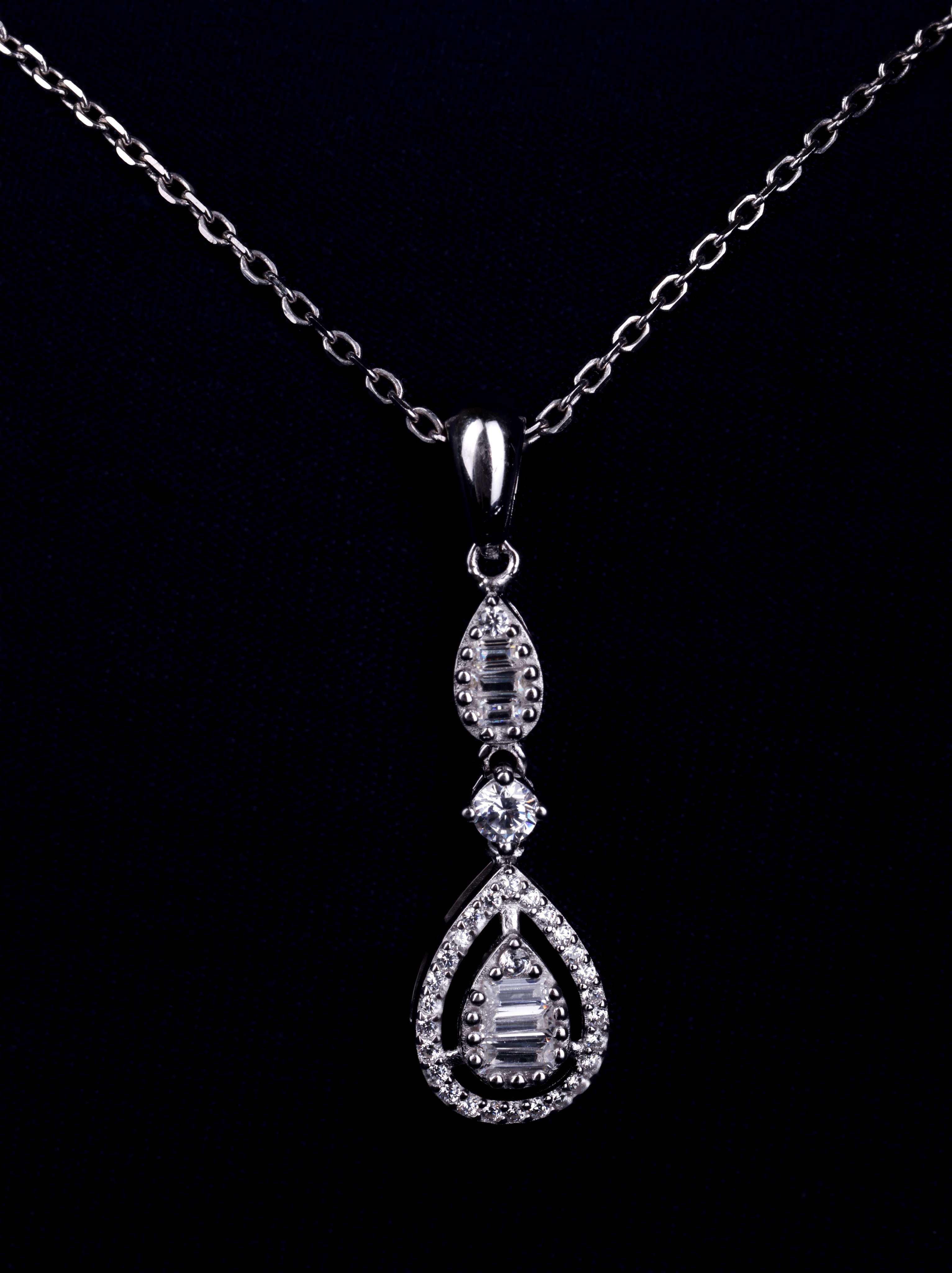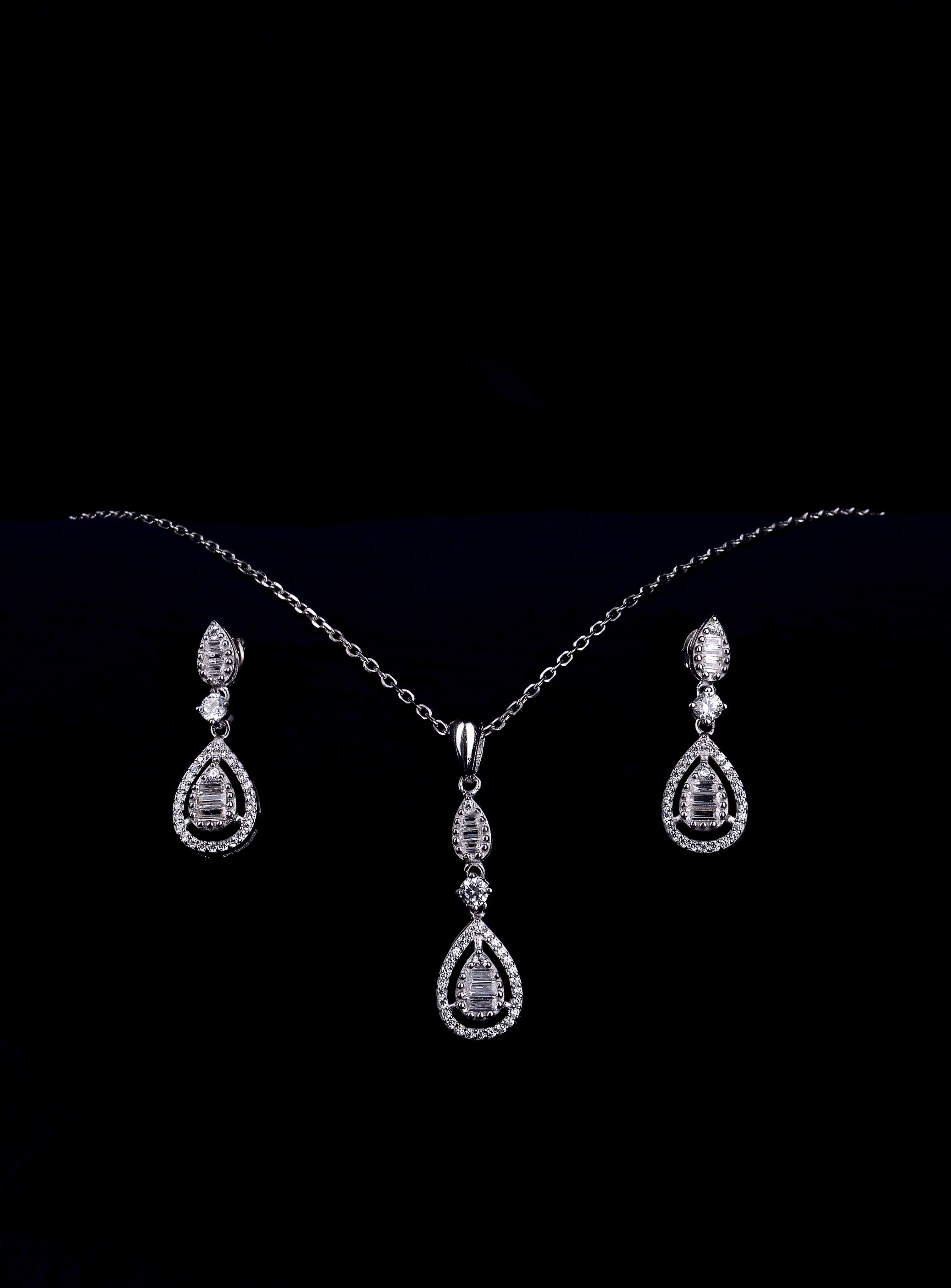 Pendant and earrings with pear-shaped stones surrounded by brilliant zircons.