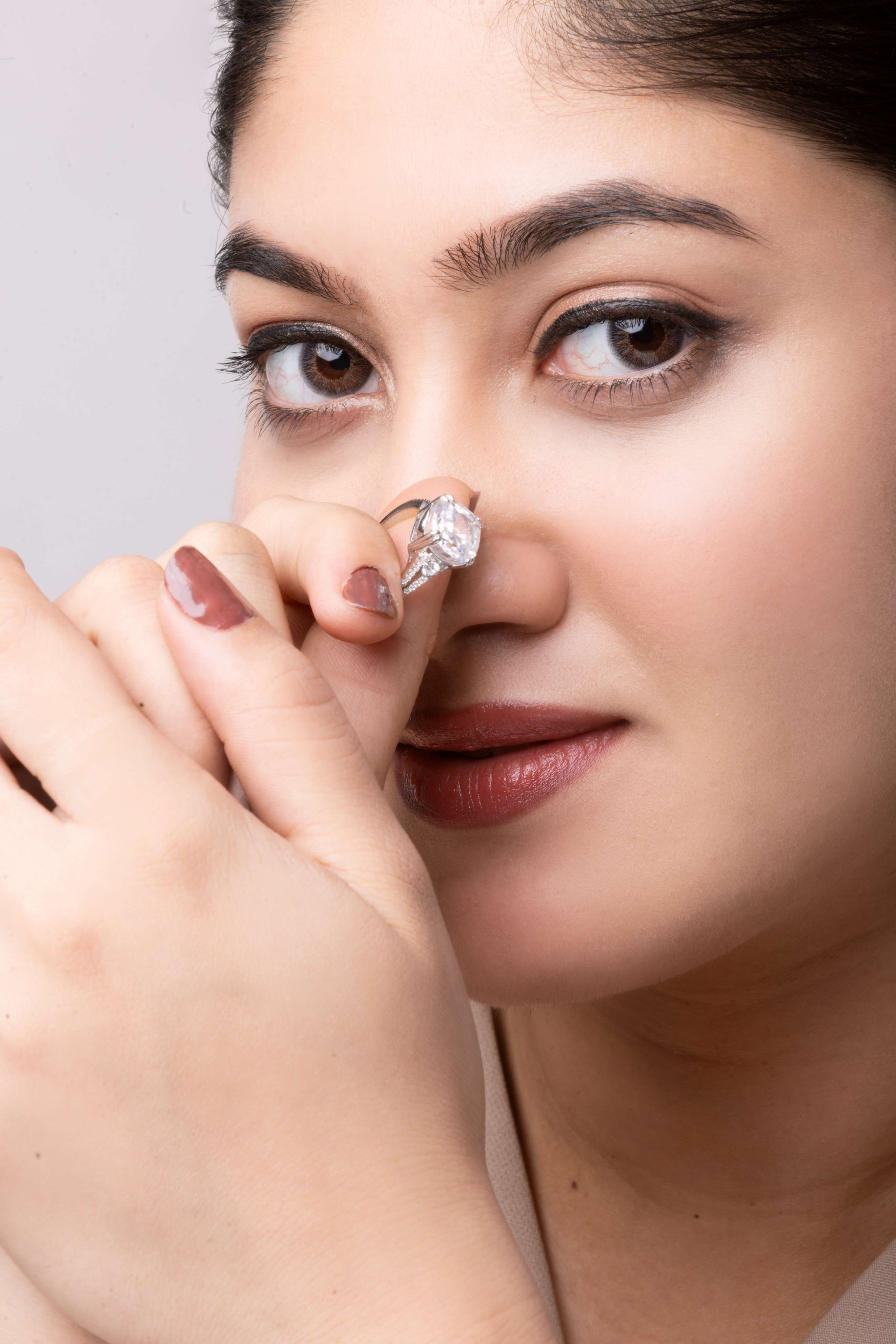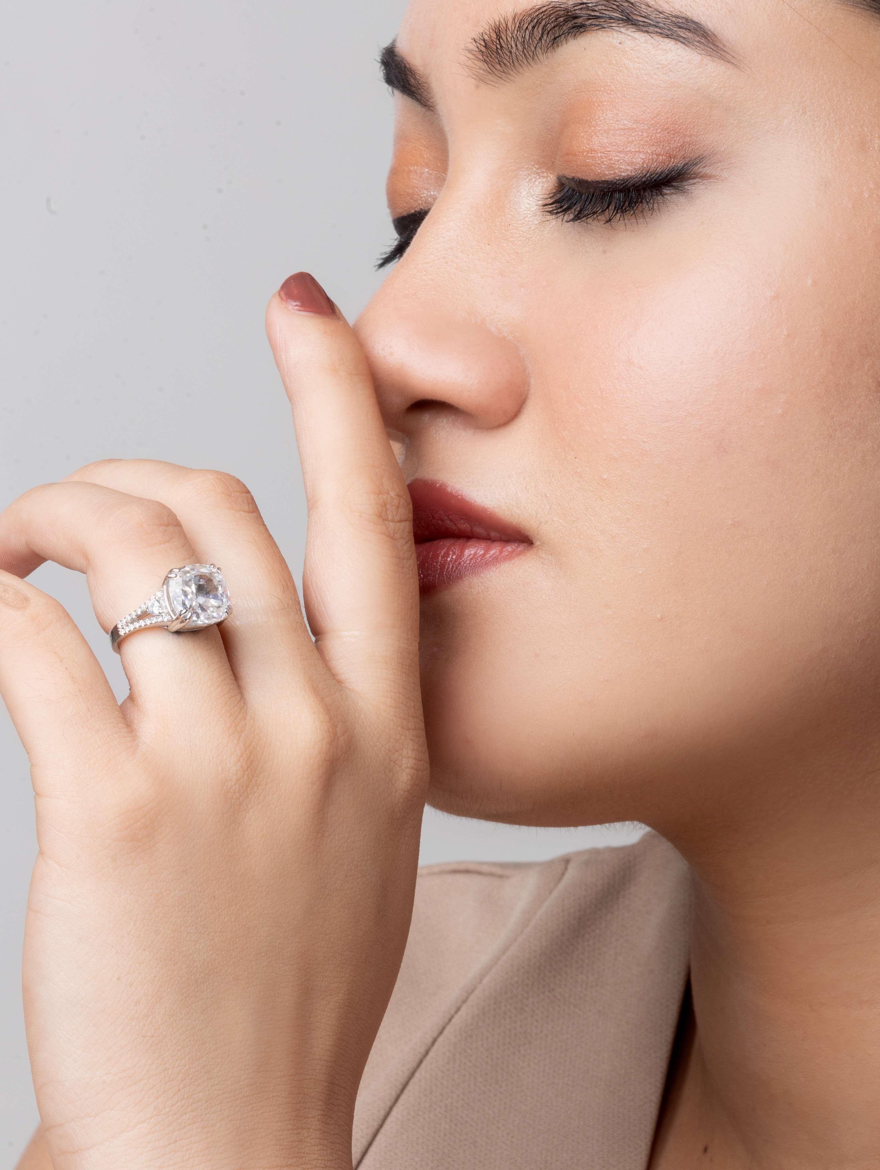 Bold cushion-cut solitaire ring with a pavé band in sterling silver.