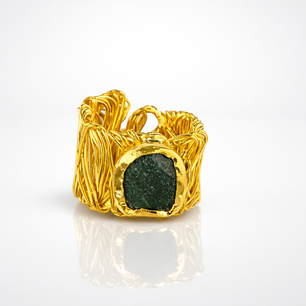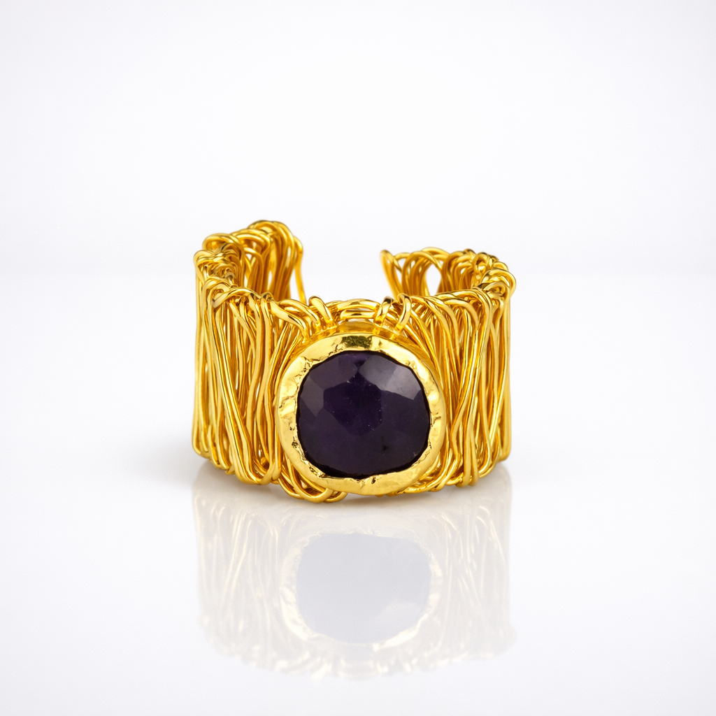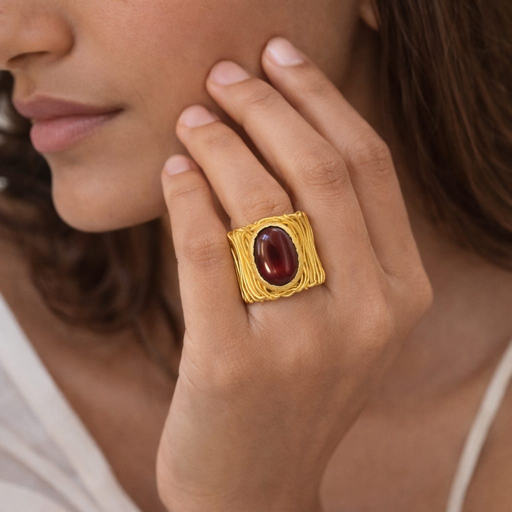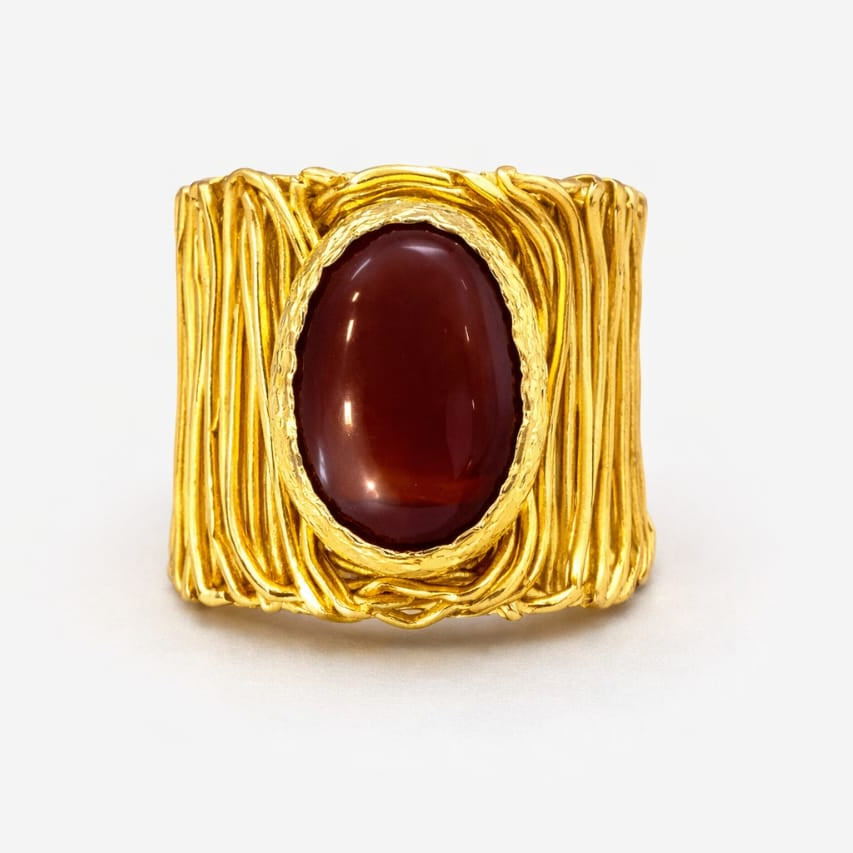 Design Philosophy: A sculptural "nest" of hand-woven gold wire protecting a deep, glowing red stone. Designed with an adjustable band, this piece ensures a bespoke fit for any finger.
