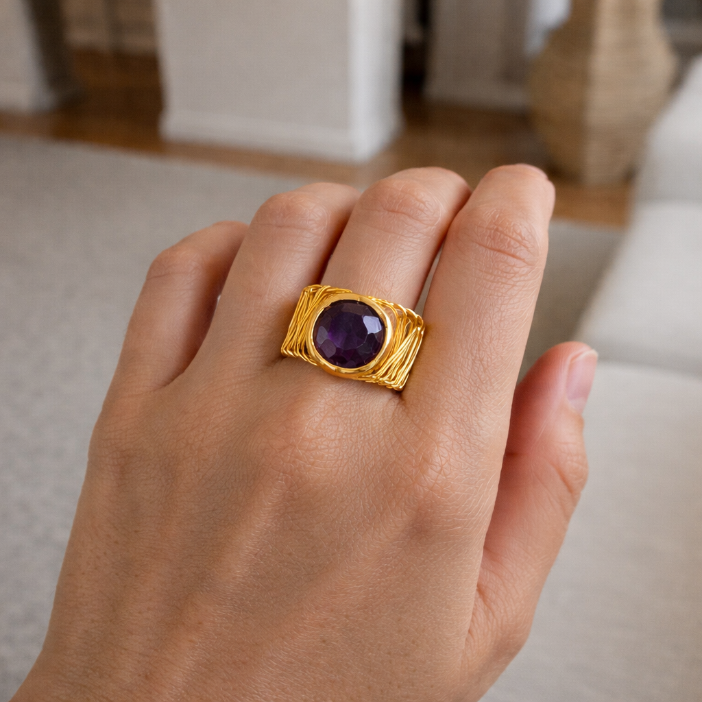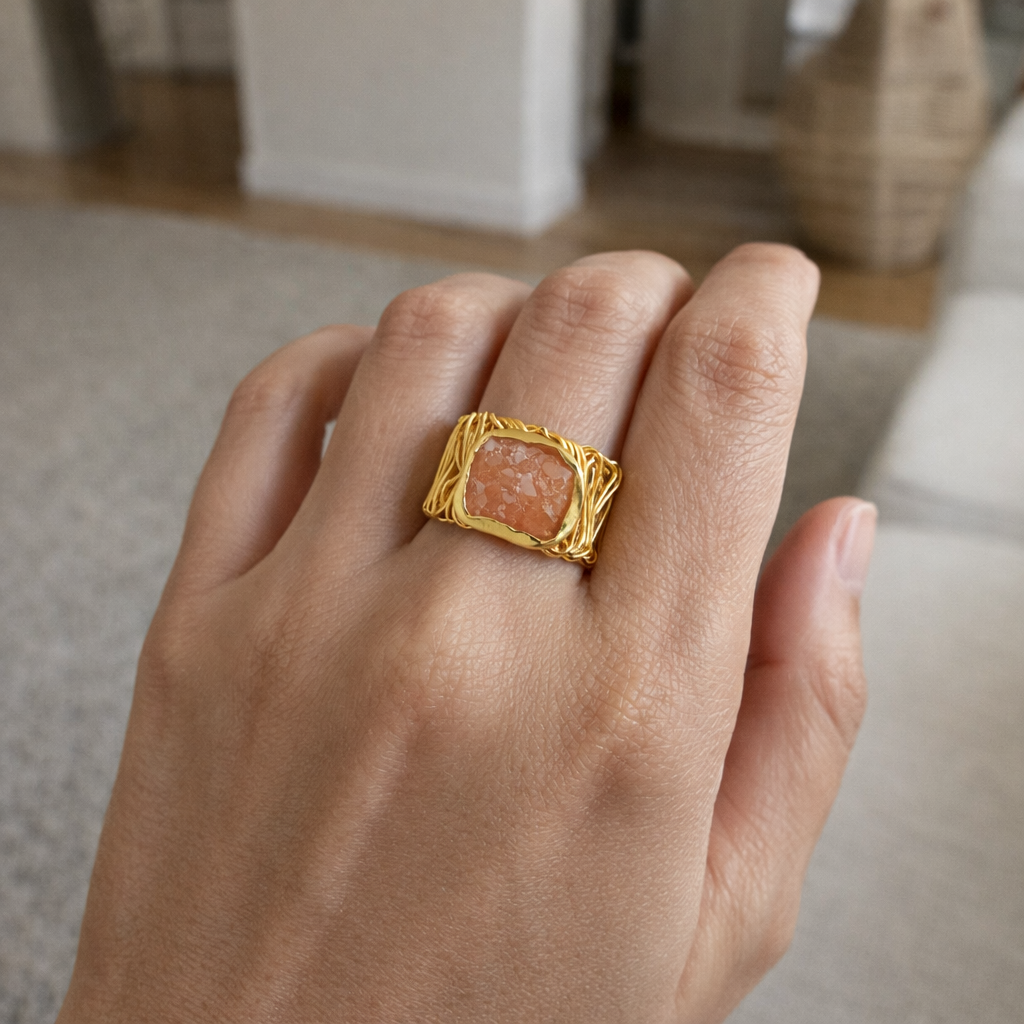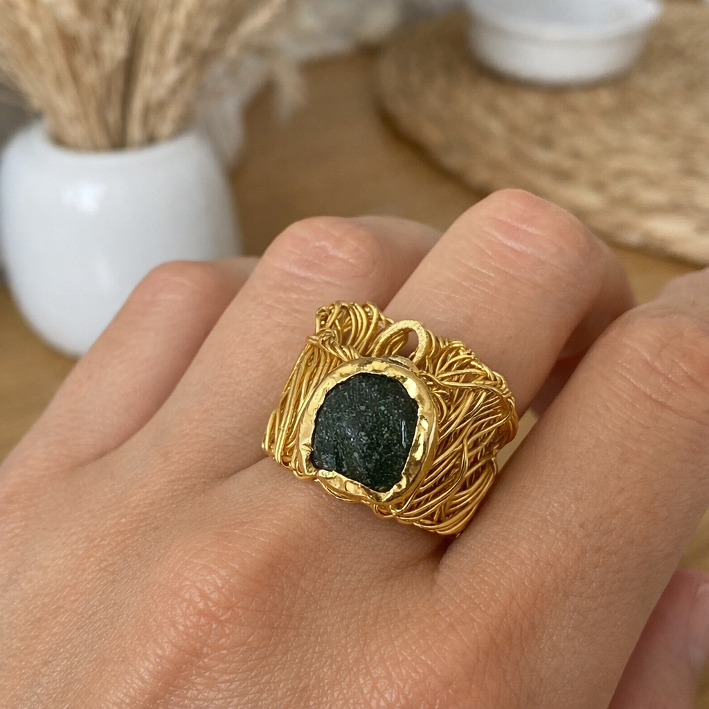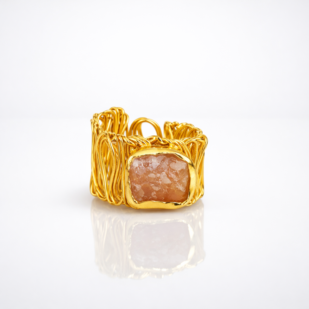 Design Philosophy: A sculptural "nest" of hand-woven gold wire protecting a deep, glowing red stone. Designed with an adjustable band, this piece ensures a bespoke fit for any finger.