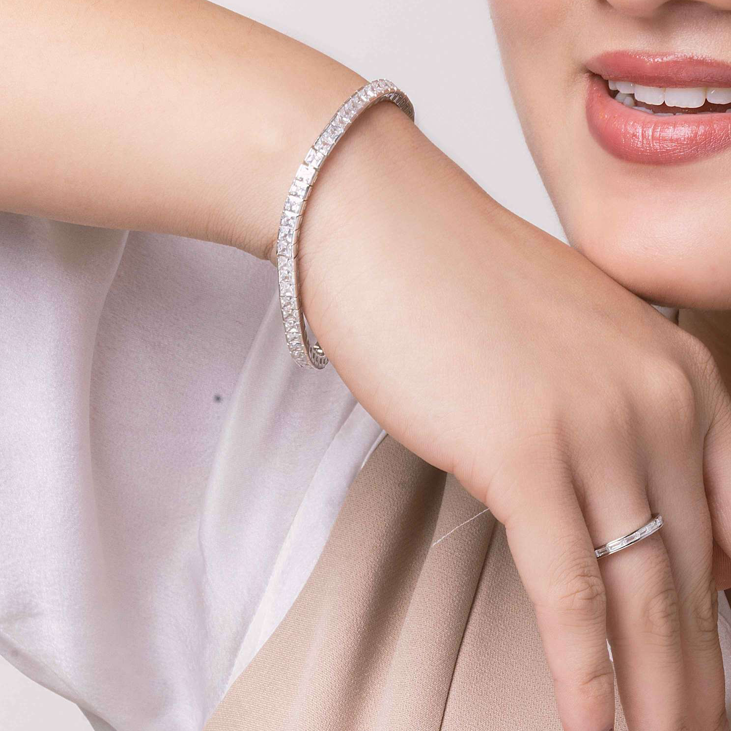 Elevate your wrist with the Glimmer Strand Tennis Bracelet from Aventara , a stunning piece featuring a row of sparkling, silver and multi-colored zircons set in 92.5 sterling silver.