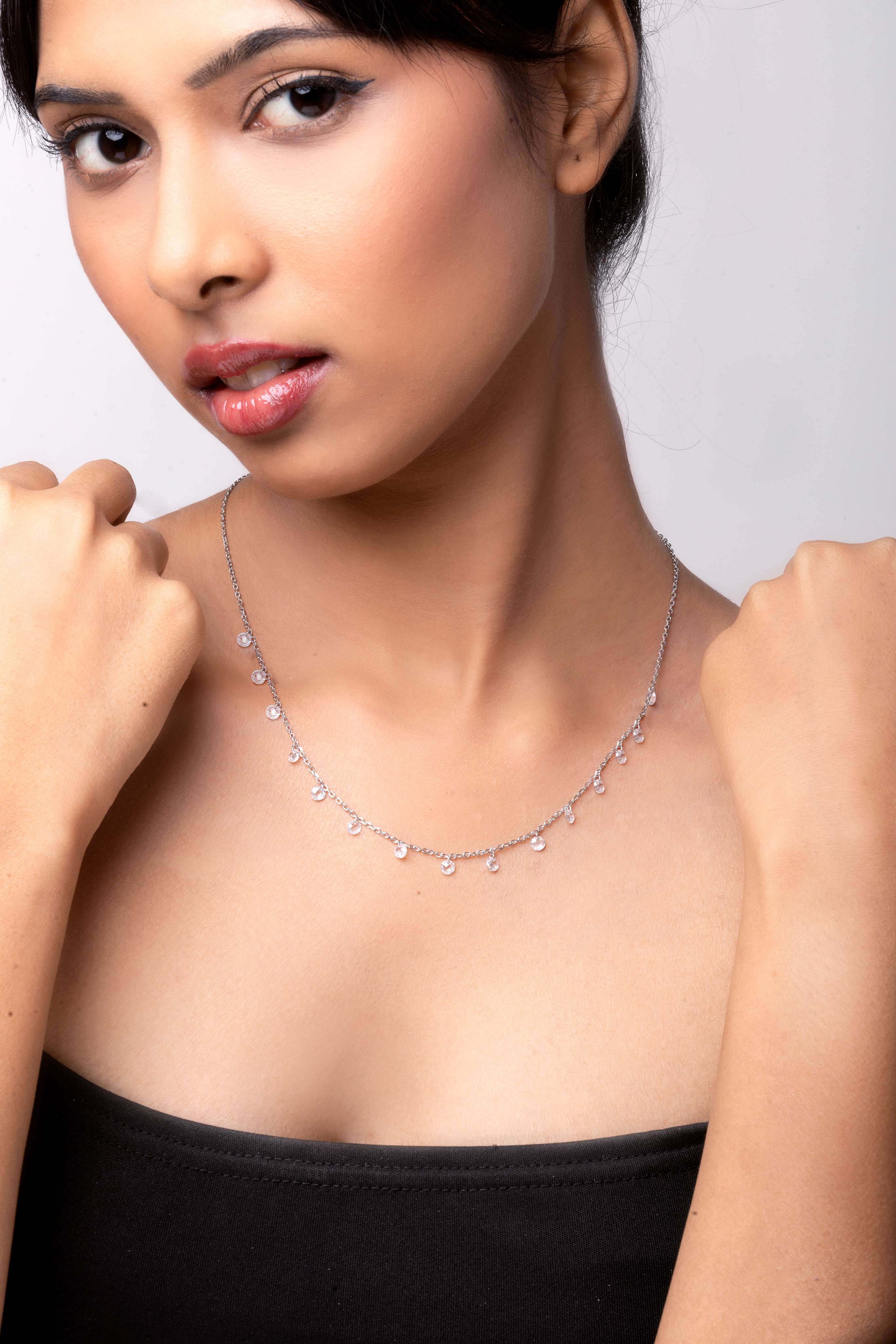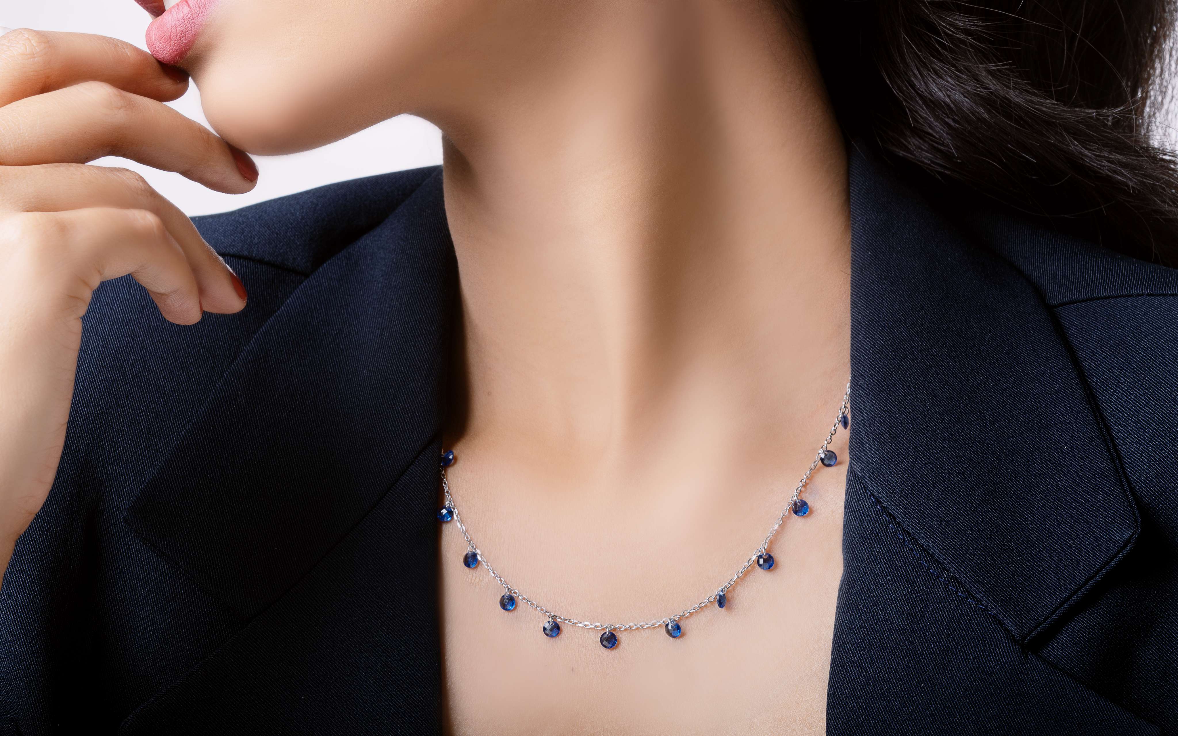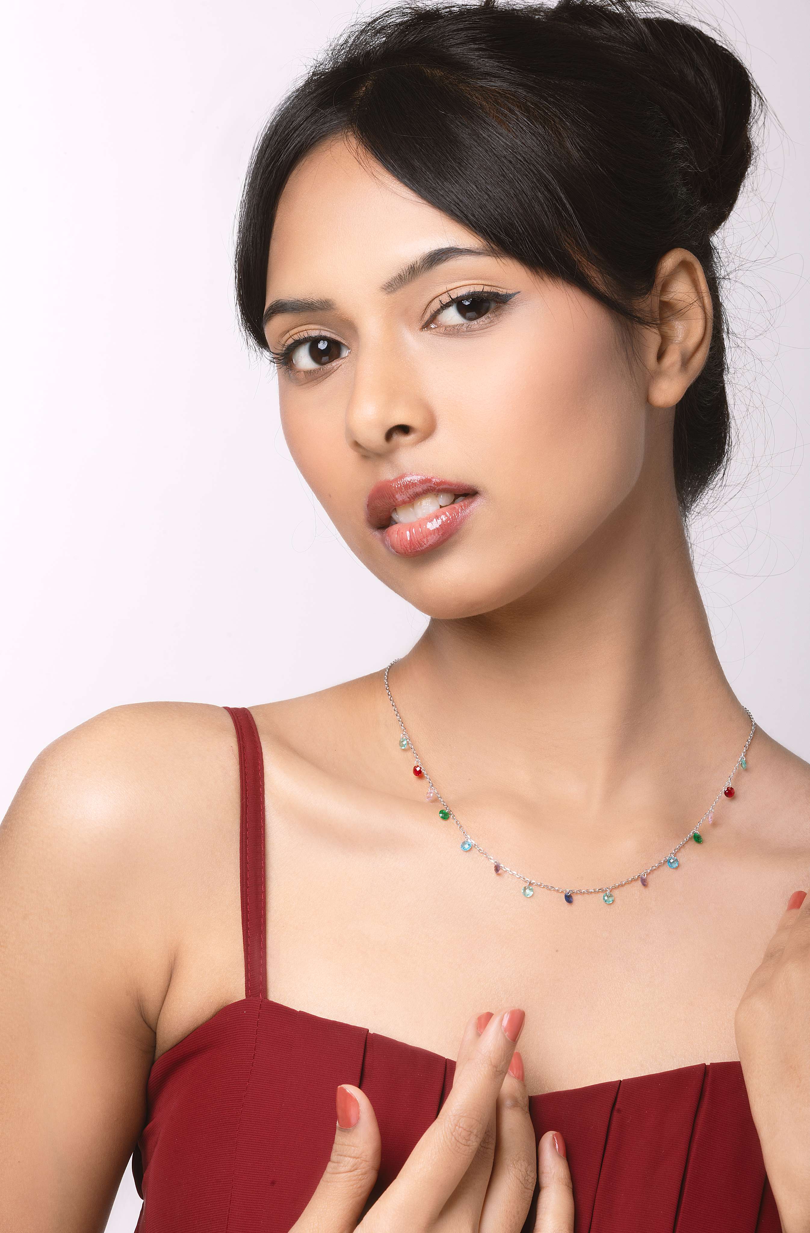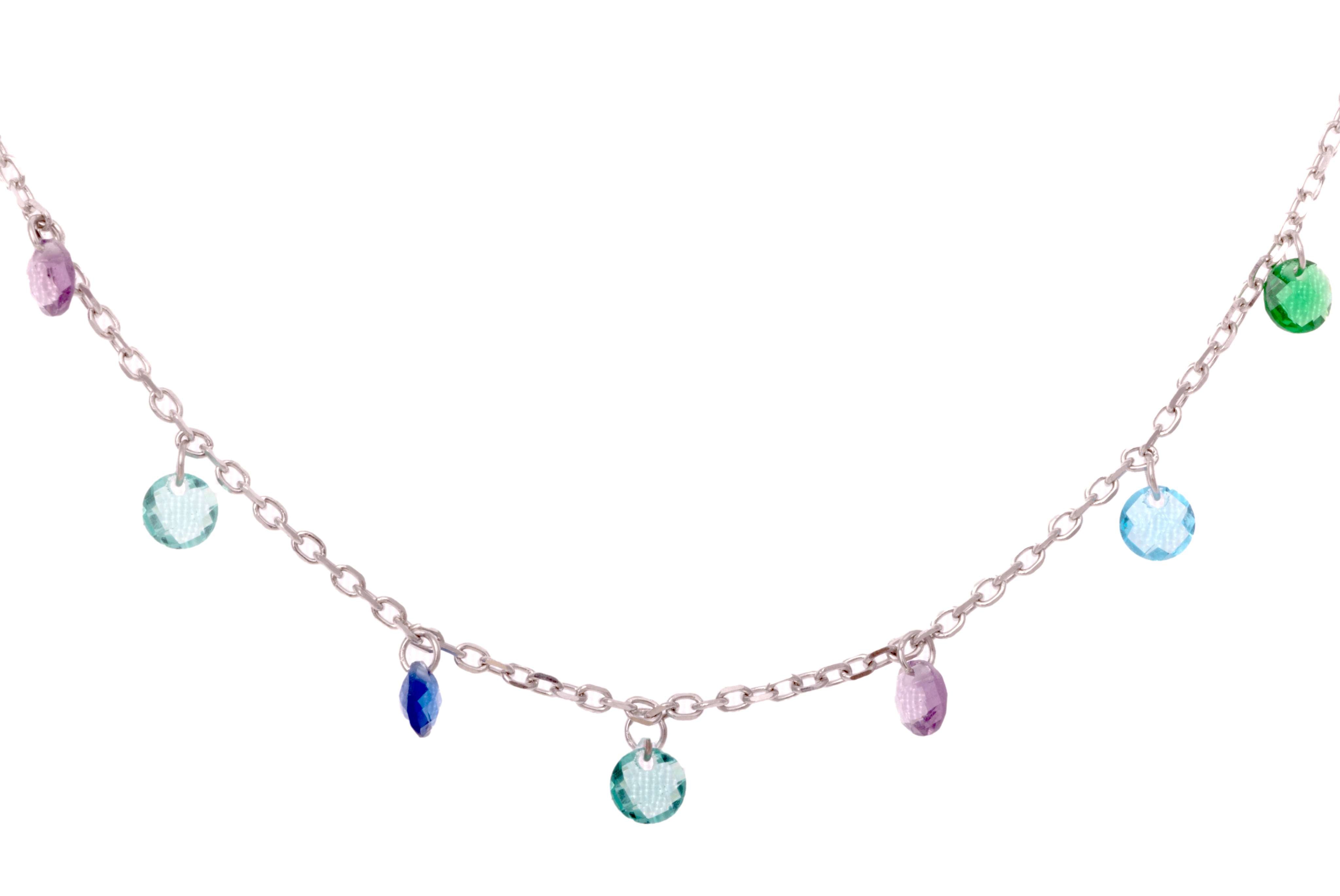 The Ocean Drop necklace features a delicate sterling silver chain from which a series of exquisite teardrop-shaped gemstones gracefully dangle. Each gem, with its captivating hue, evokes the serene beauty of a deep ocean current or a glistening water droplet.