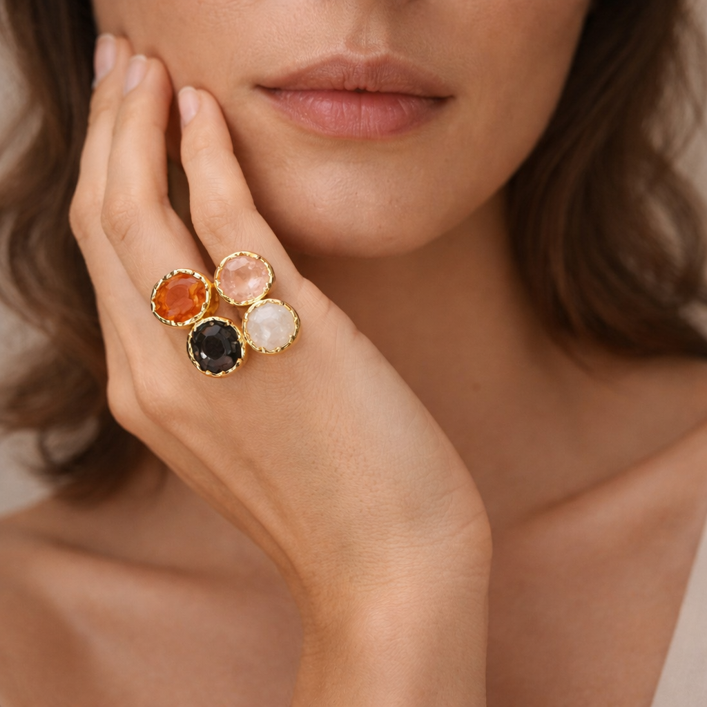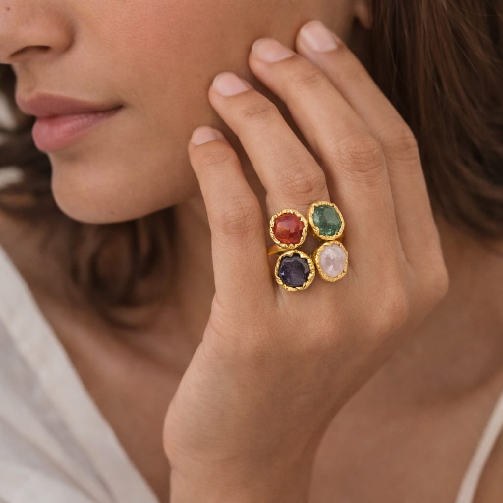 Design Philosophy: Celebrates the earth’s raw state with four uncut gemstones set in hammered gold. Designed with an adjustable band, this piece ensures a bespoke fit for any finger.
